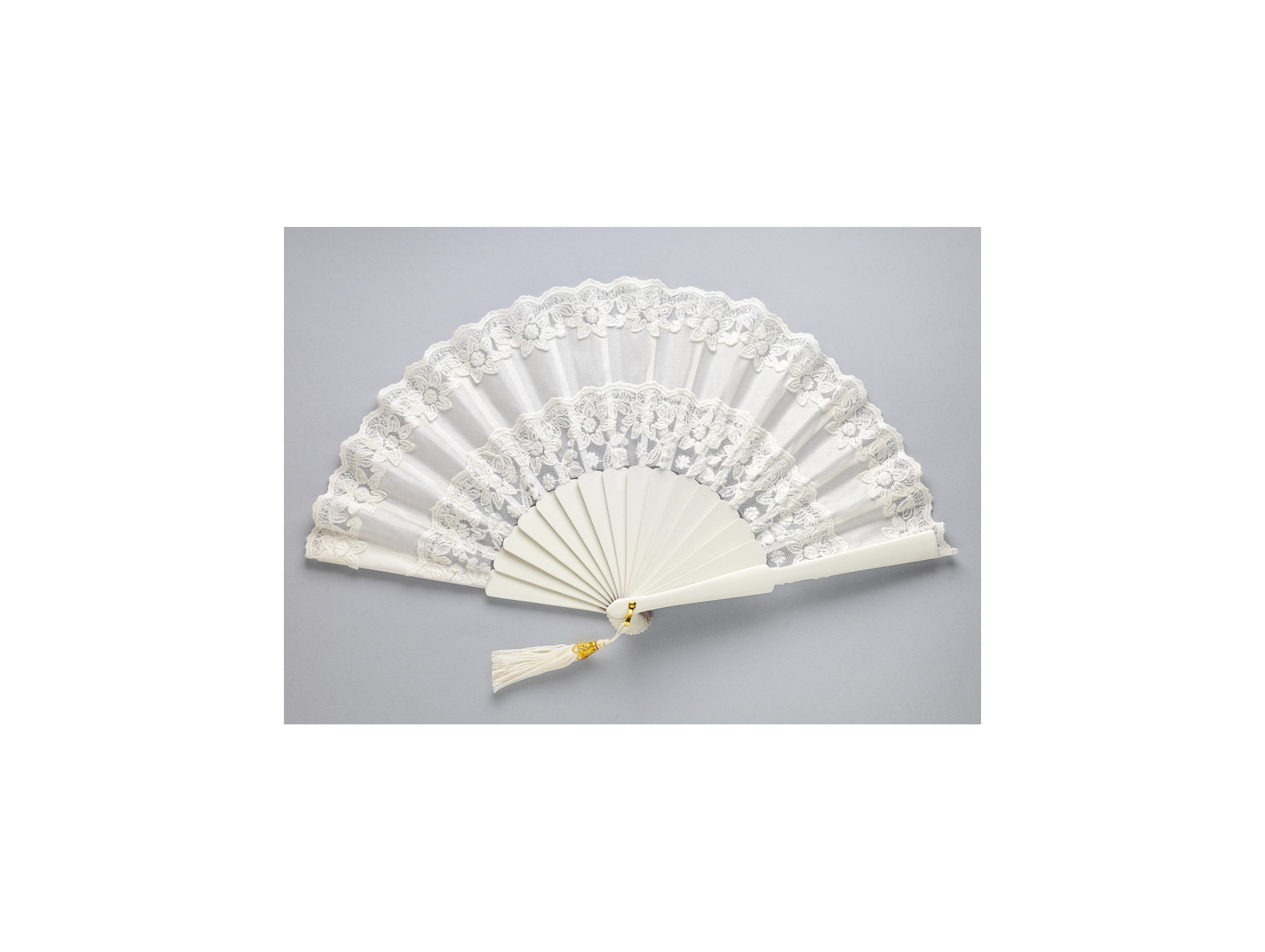 País de algodón y encaje con forma de margaritas decoran el abanico dándole un diseño muy delicado