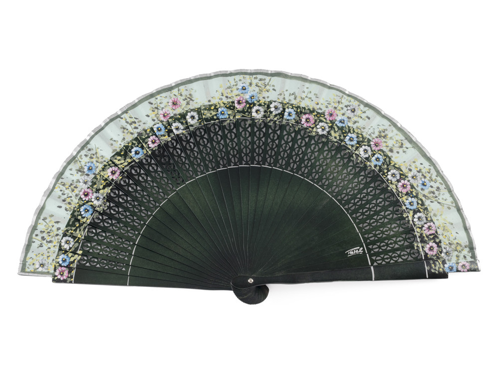 Precioso abanico de madera de abedul pintado a mano, satinado por ambas caras.