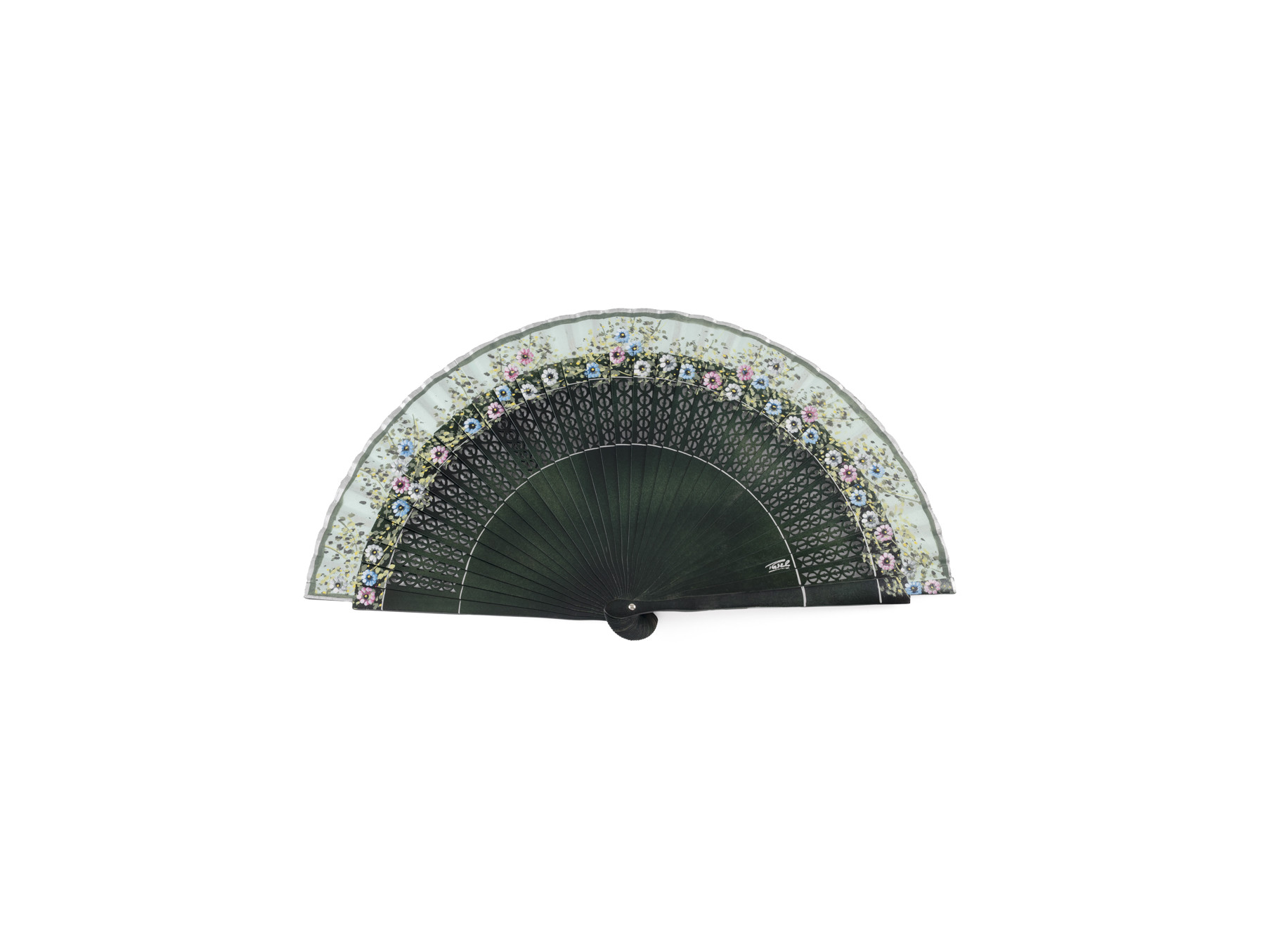 Varillaje calado en color verde oscuro, decorado en su parte superior con pequeñas flores en azul, blanco y rosa; algunas de ellas también "salpican" el país de algodón en color verde agua.