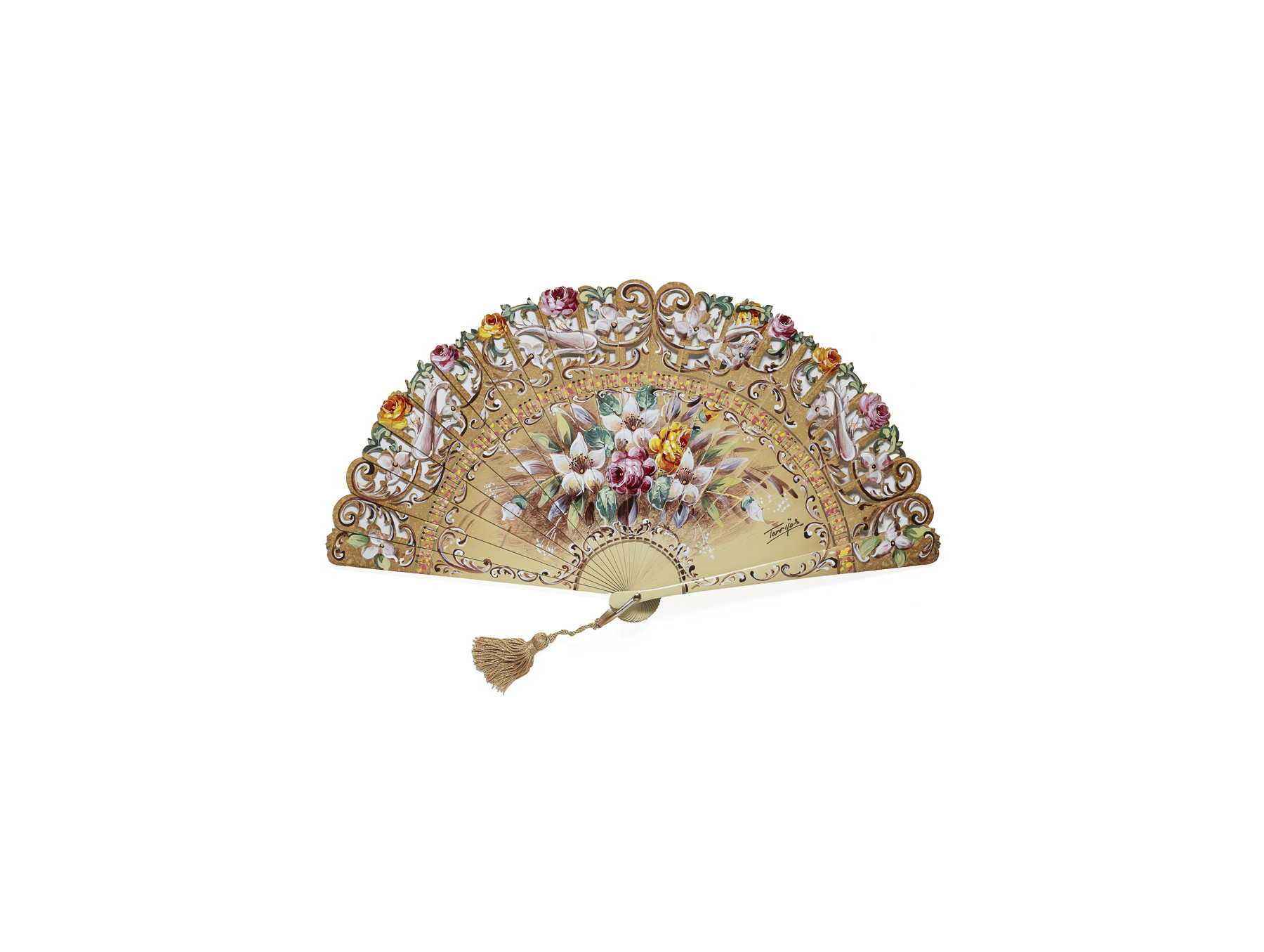 Destacan los delicados detalles de volutas en color ocre oscuro y blanco que recorren todo el abanico, junto con el terminado de su varillaje en forma de flores