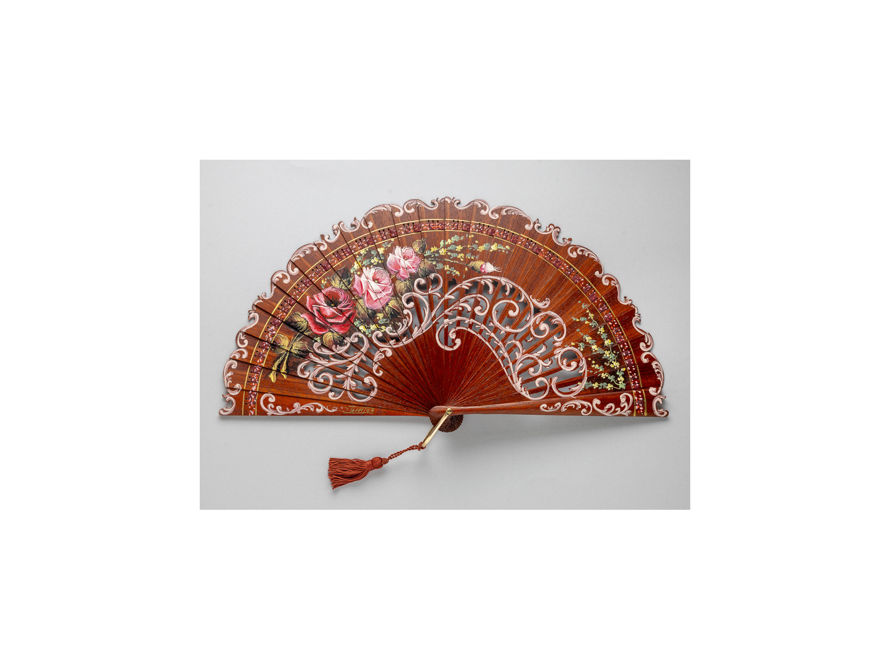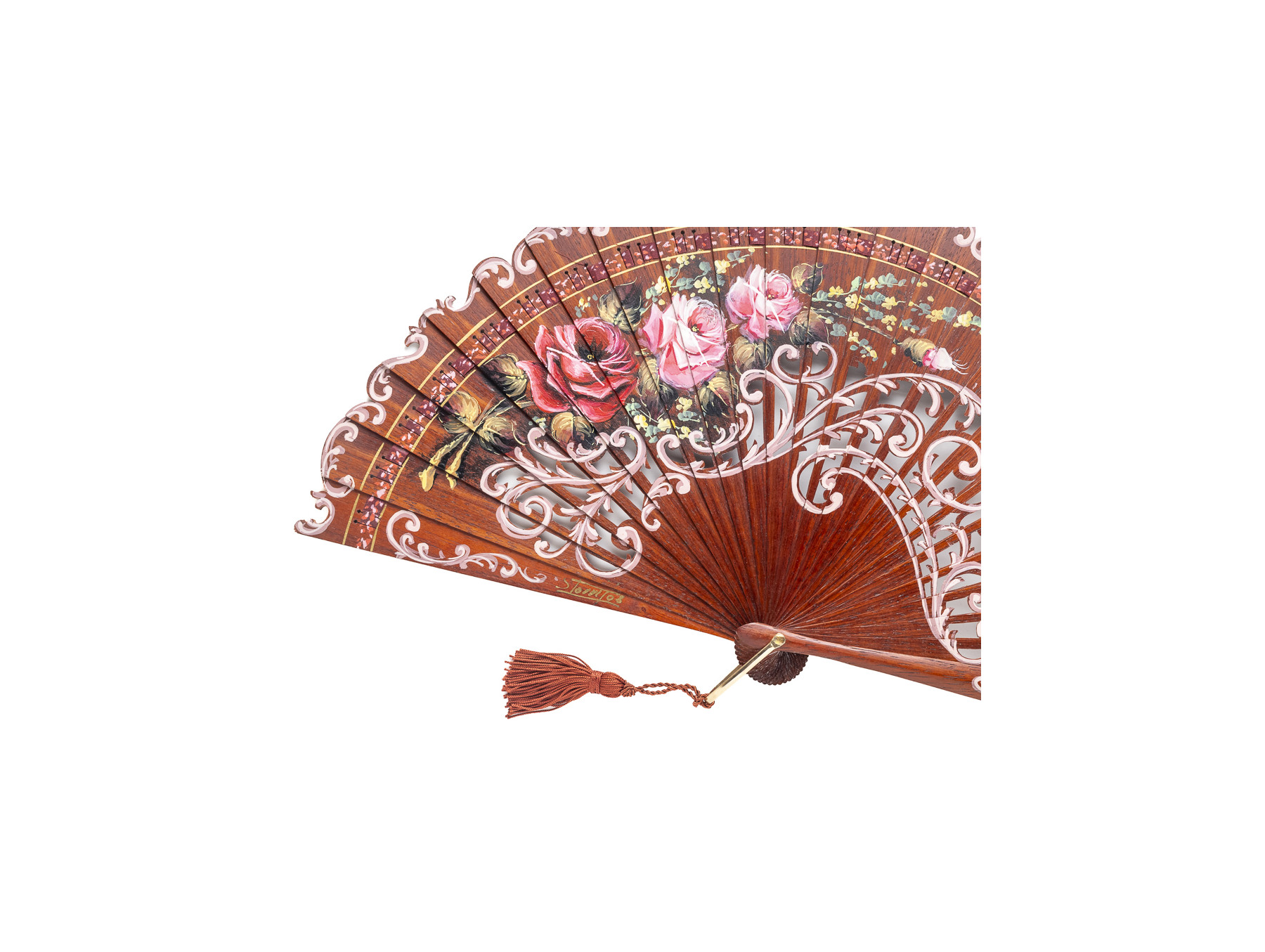 Detalle de anilla en dorado y borla a juego con el tono de la madera del abanico