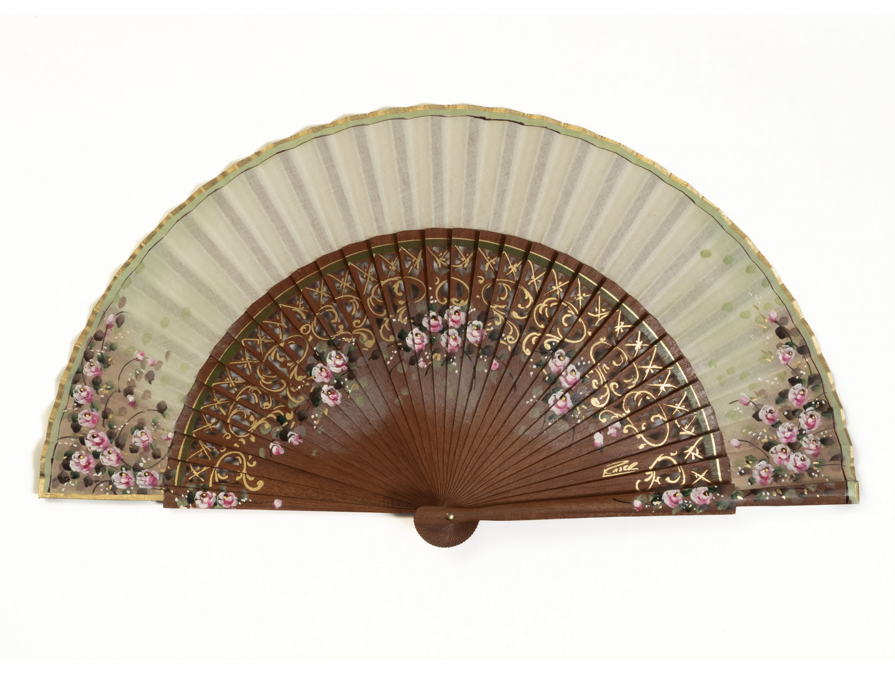 Precioso y elegante abanico realizado en madera de sipo, madera en este caso en color marrón rojizo y con bonitas vetas en ella. Suave decoración pintada a mano con tonos ocre en degradado y pequeños grupos de rosas mini