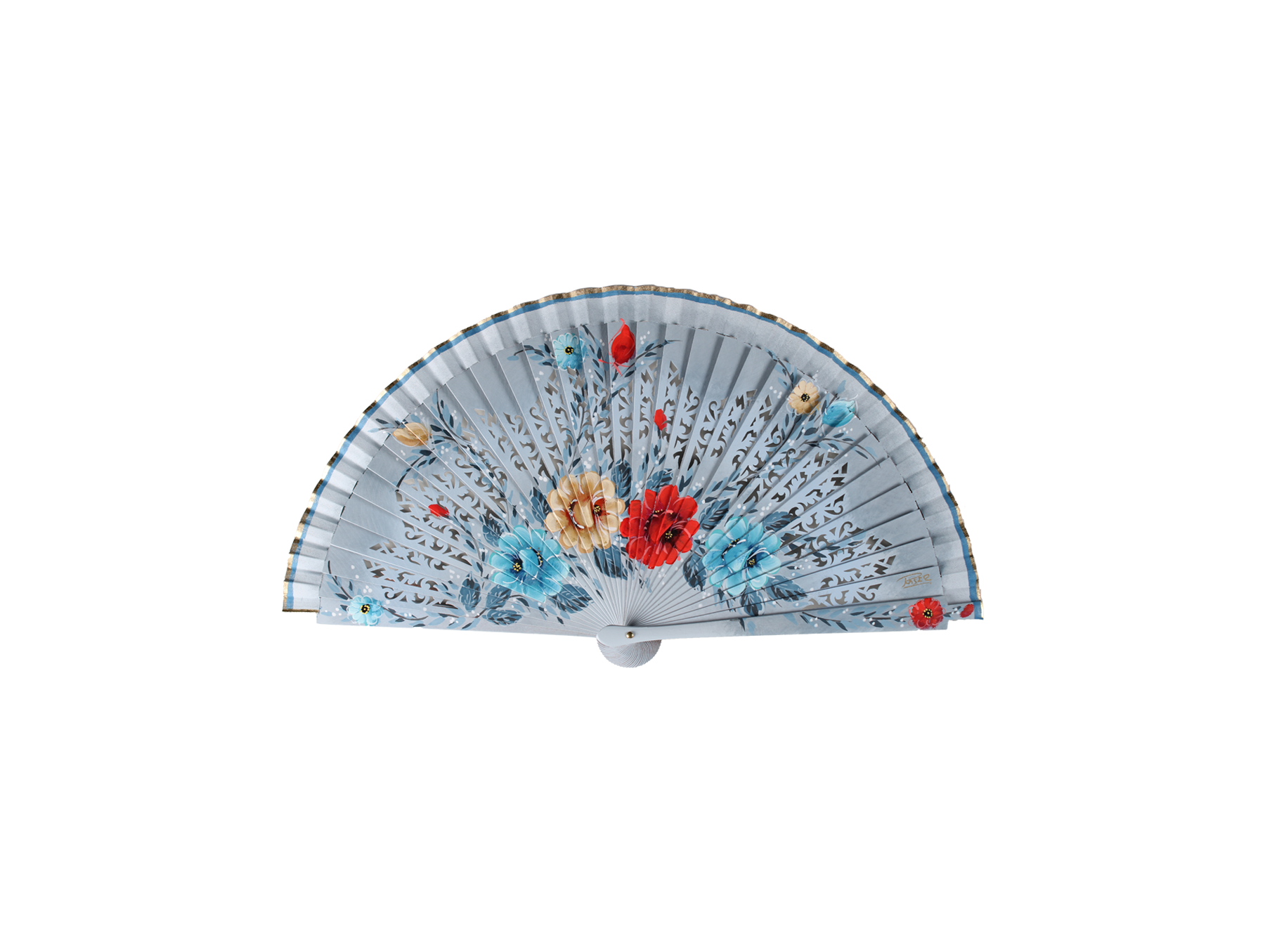 Pintado a mano con motivo principal cuatro rosas silvestres en colores: Azul bebé, naranja claro, rojo y gris. Pequeños detalles florales por la parte superior del abanico.