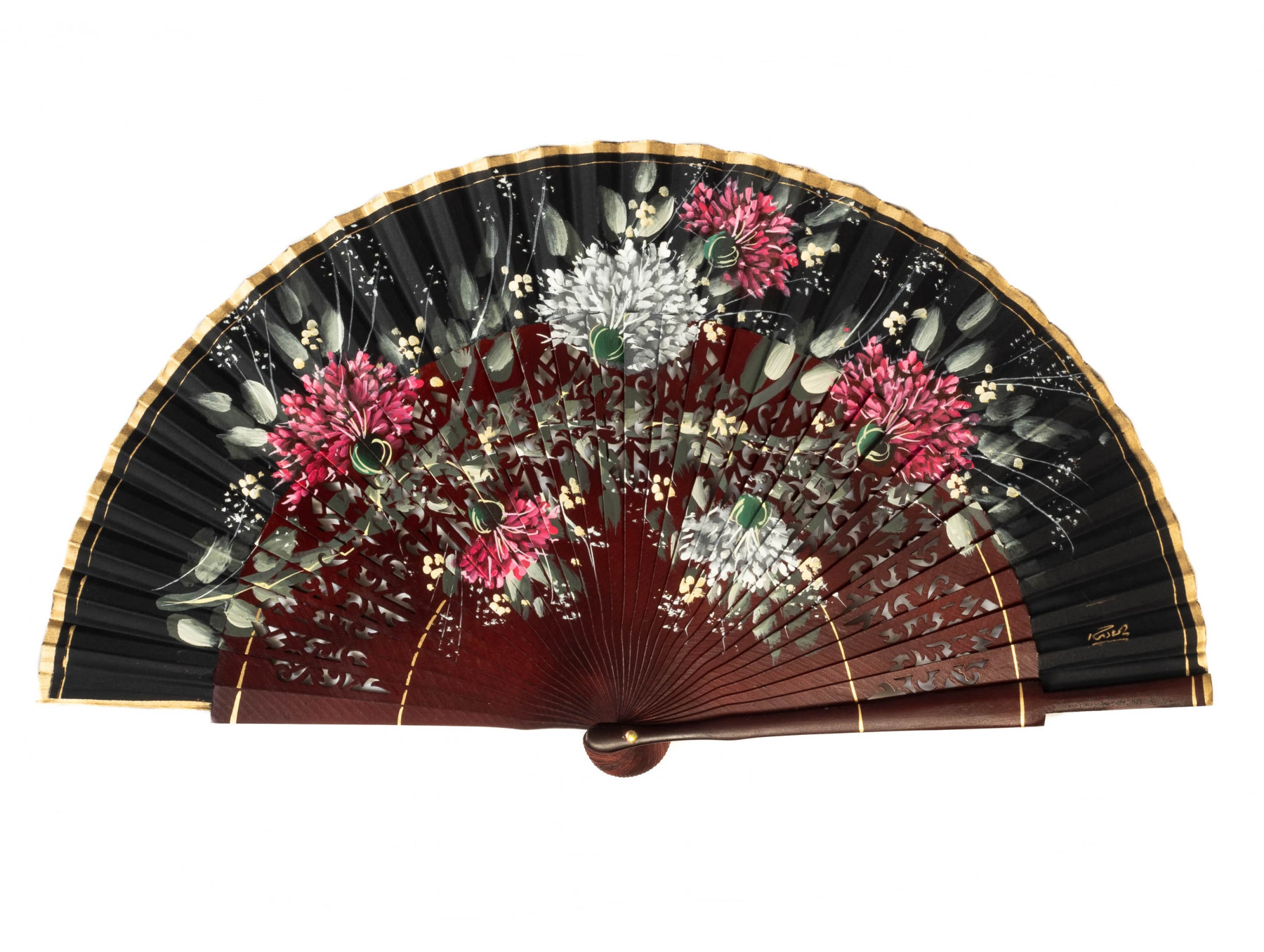 Bonito abanico de varillaje calado de madera de abedul que mantiene su color original con dibujos de hortensias de color fúcsia y lavanda que se extienden hasta el país del abanico de color negro y filet en dorado