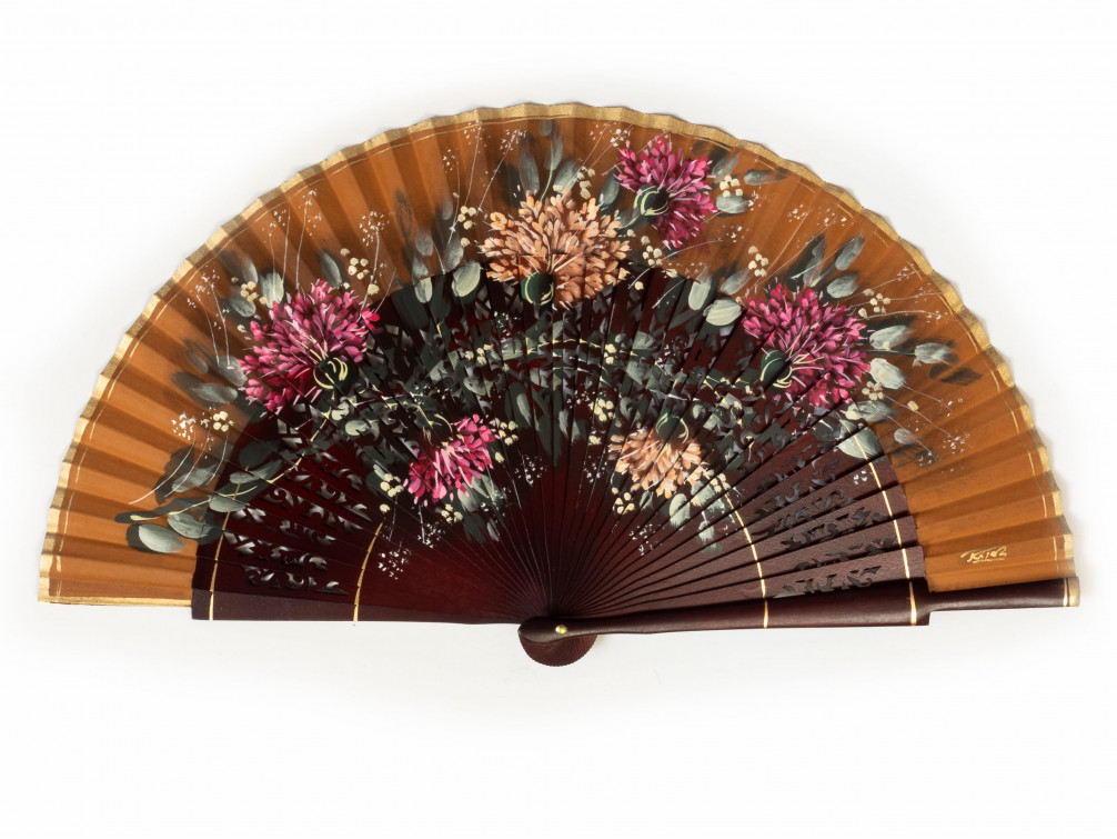 Bonito abanico de varillaje calado de madera de abedul que mantiene su color original con dibujos de hortensias de color fúcsia y coral que se extienden hasta el país del abanico de color coral y filet en dorado