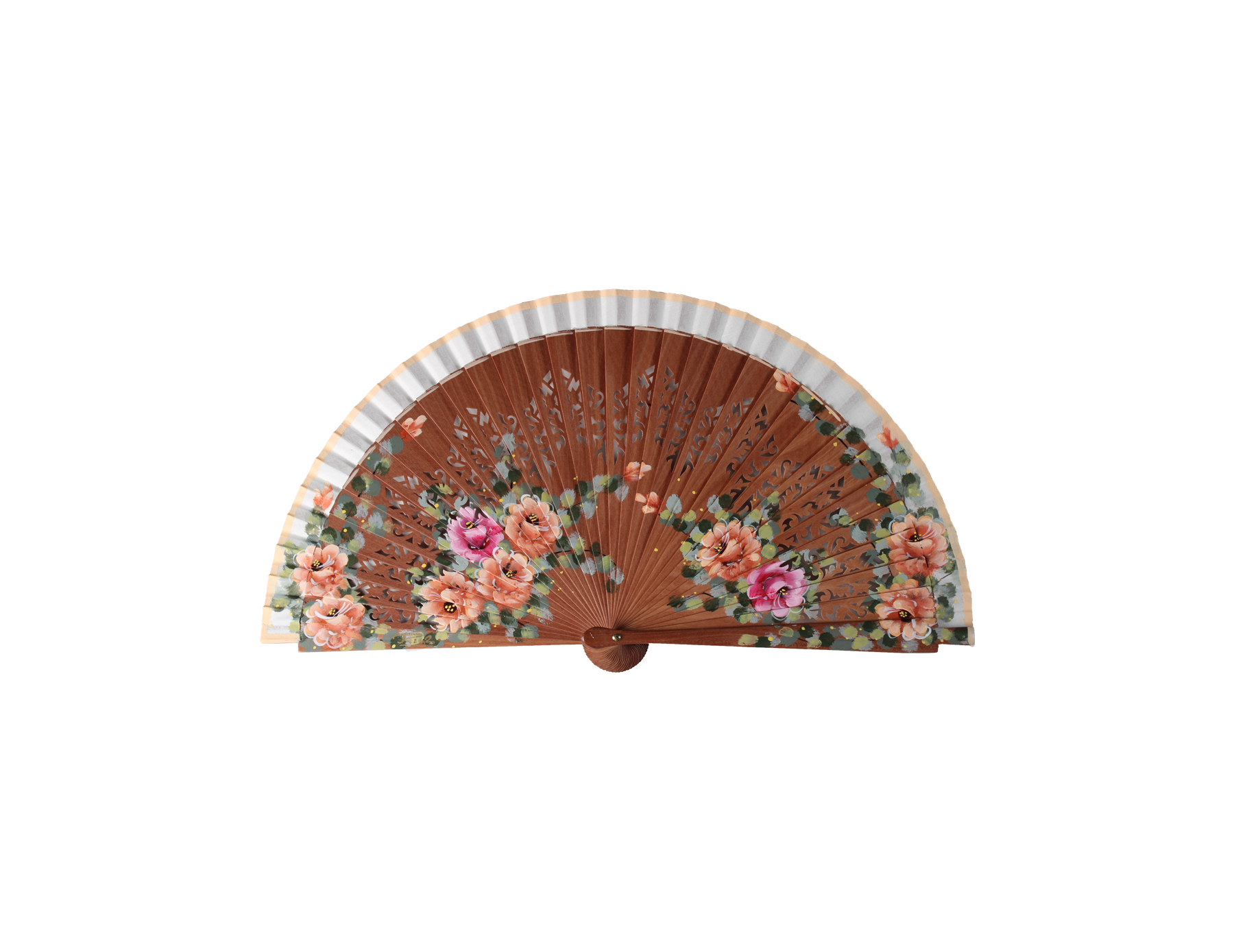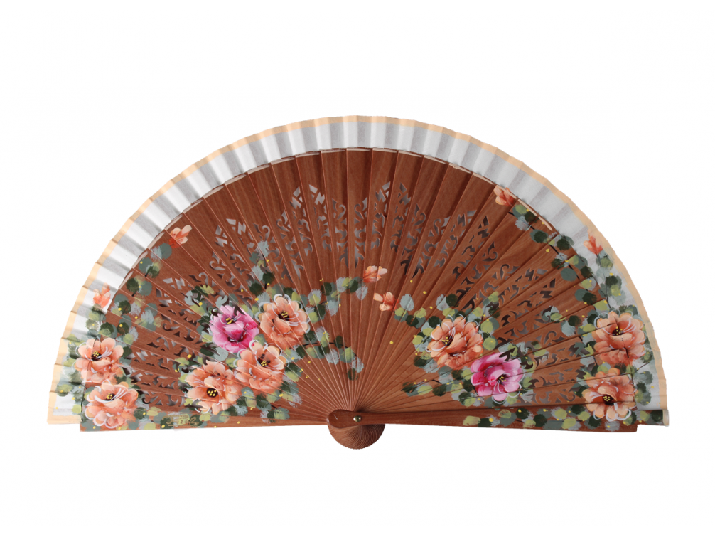 Varillaje en color natural de la madera, se encuentra calado por un precioso tallado. Por este, se extiende una bonita pintura donde se aprecian flores de color naranja pastel y rojo sobre hojarasca de diferentes tonos verdes.