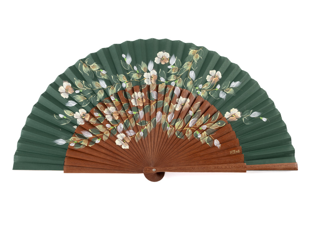 Varillaje en color natural del abanico por el que se extienden preciosas flores de color blanco roto acompañadas de hojas verdes de diferentes tonos.