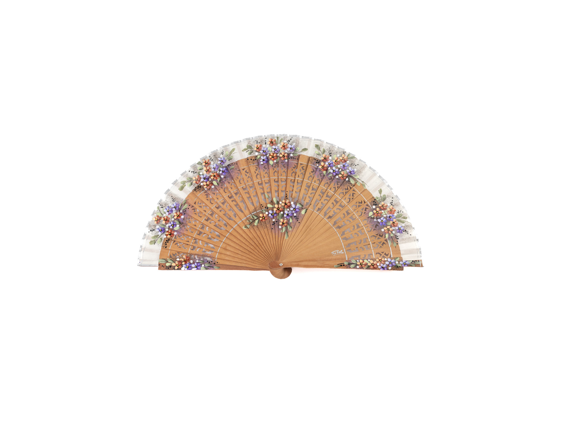 Varillaje en color natural de la madera que se encuentra calado de un elegante diseño, por el mismo varillaje se extienden tres delicadas líneas en color plata que acompañan a las pequeñas flores naranjas y moradas.