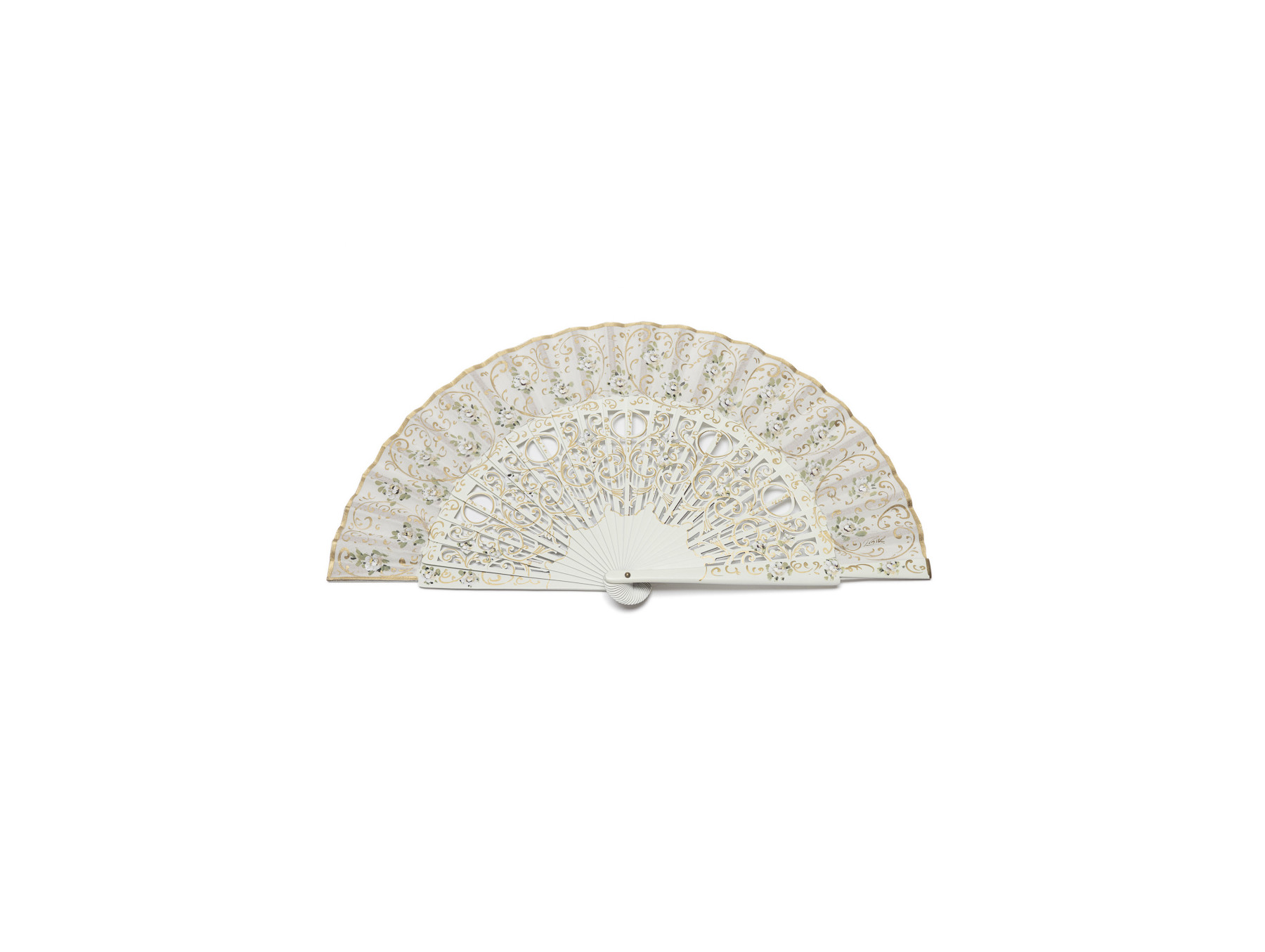 Varillaje calado detallado con bonitas formas acompañadas de pinceladas doradas que se extienden por todo el abanico
