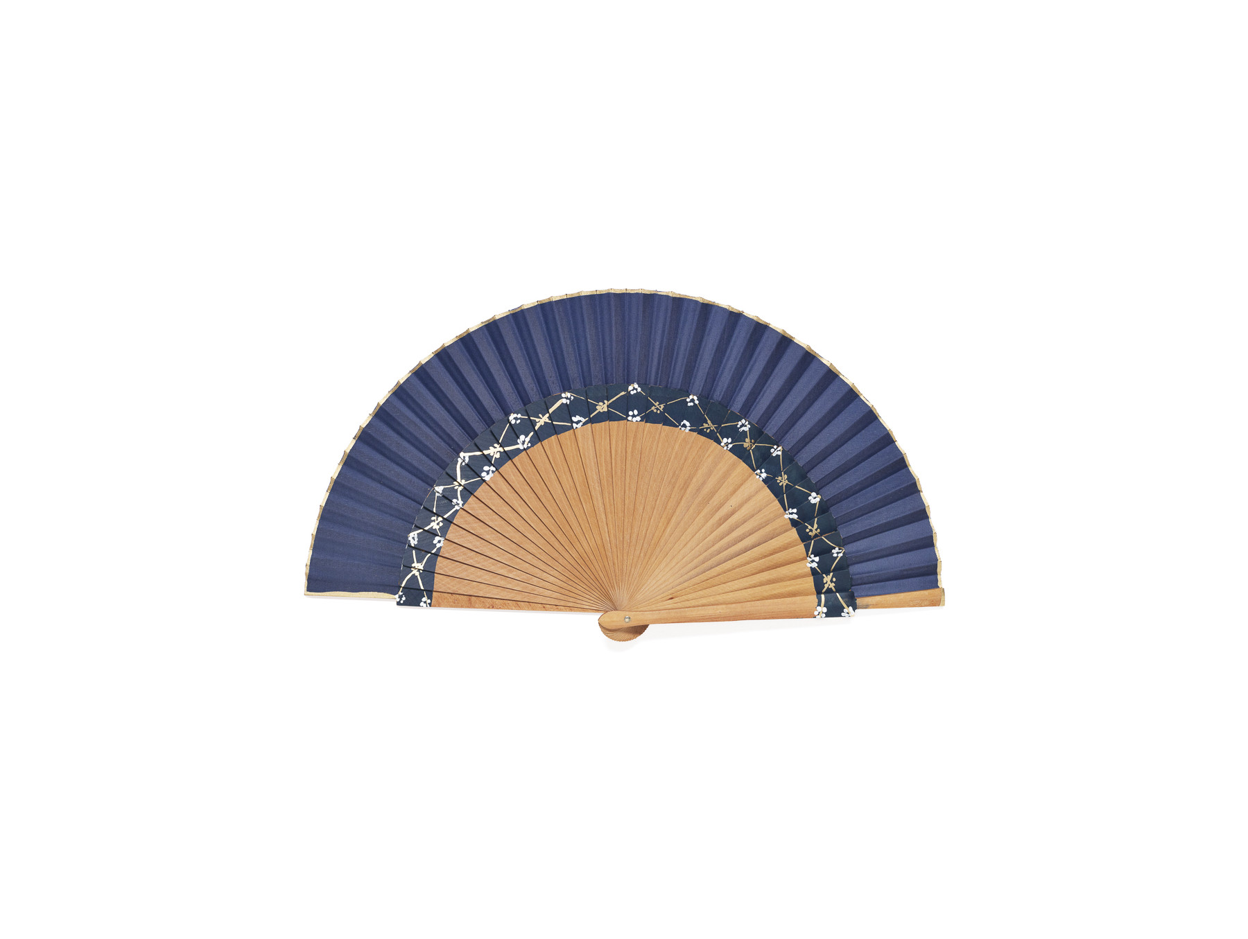 Sobre su varillaje, de color natural del abanico, se extiende una tira de color azul oscuro sobre la que se dibujan florecillas en color blanco y dorado, a juego con el filet del abanico, también en dorado