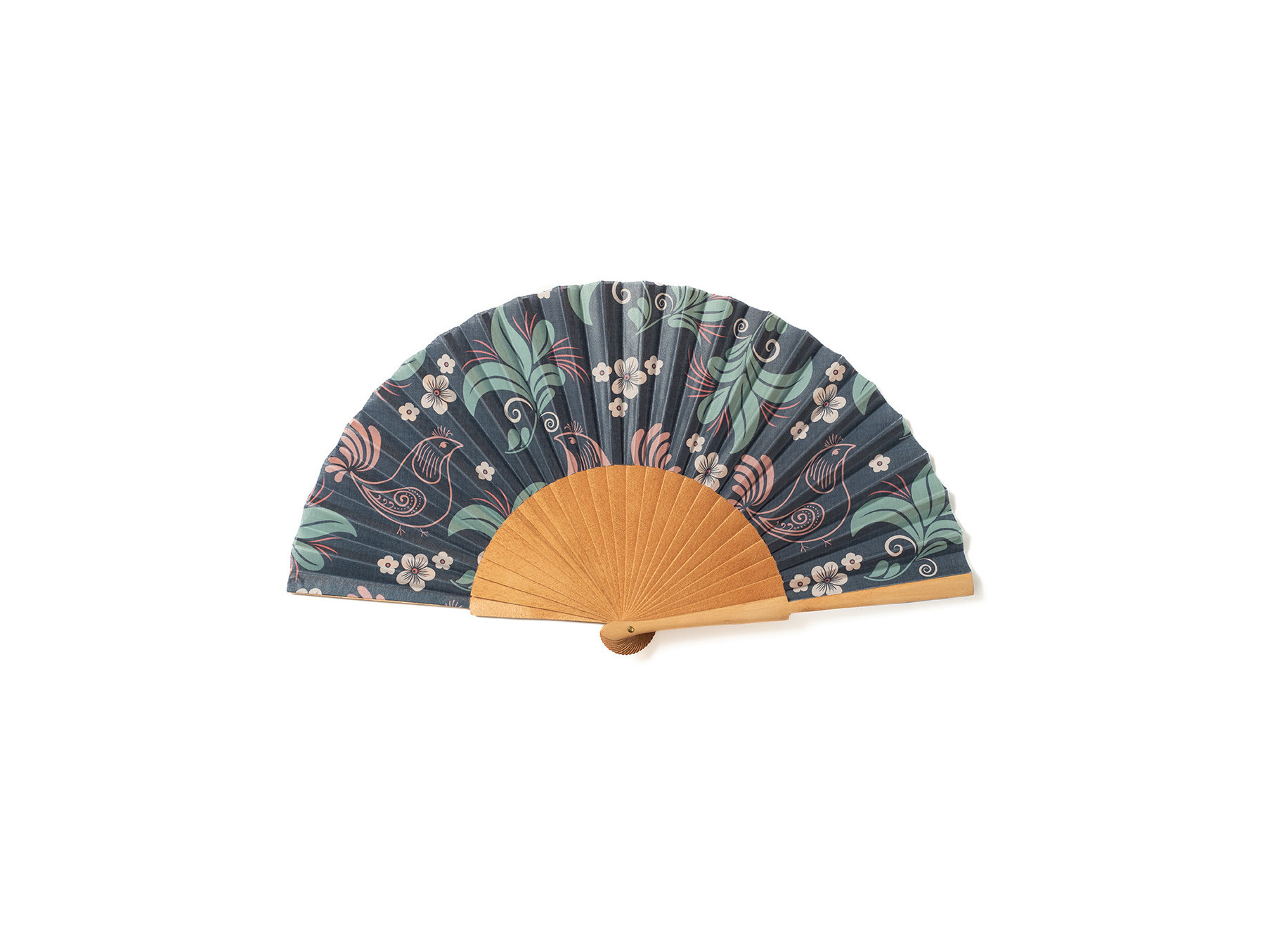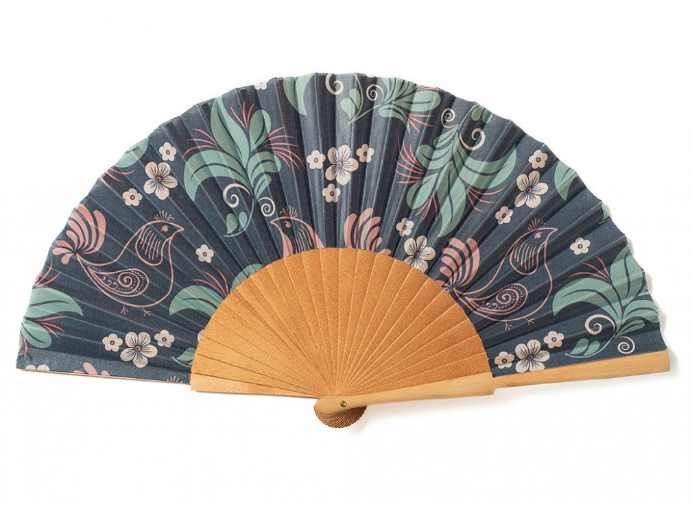 Abanico artesanal, elaborado en madera de sicomoro pulido y algodón estampado. Con detalle de flores y aves, sobre país en tono marino.