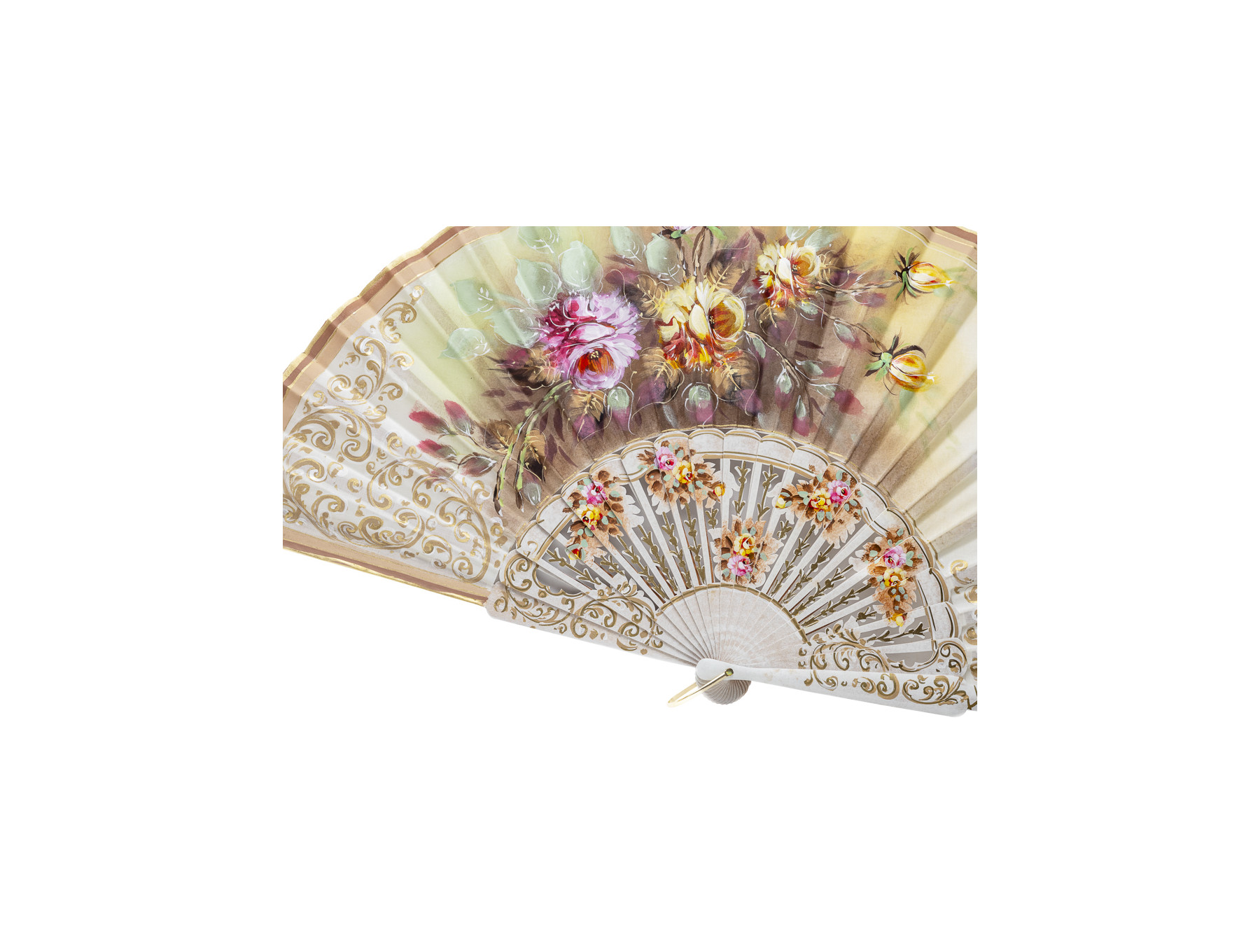 El varillaje calado forma unas preciosas formas en hojas que acompañan a las delicadas flores de color rosa y amarillo decoradas alrededor con hojas verdes y marrones. Se pueden apreciar en todas las varillas elegantes detalles de color dorado.