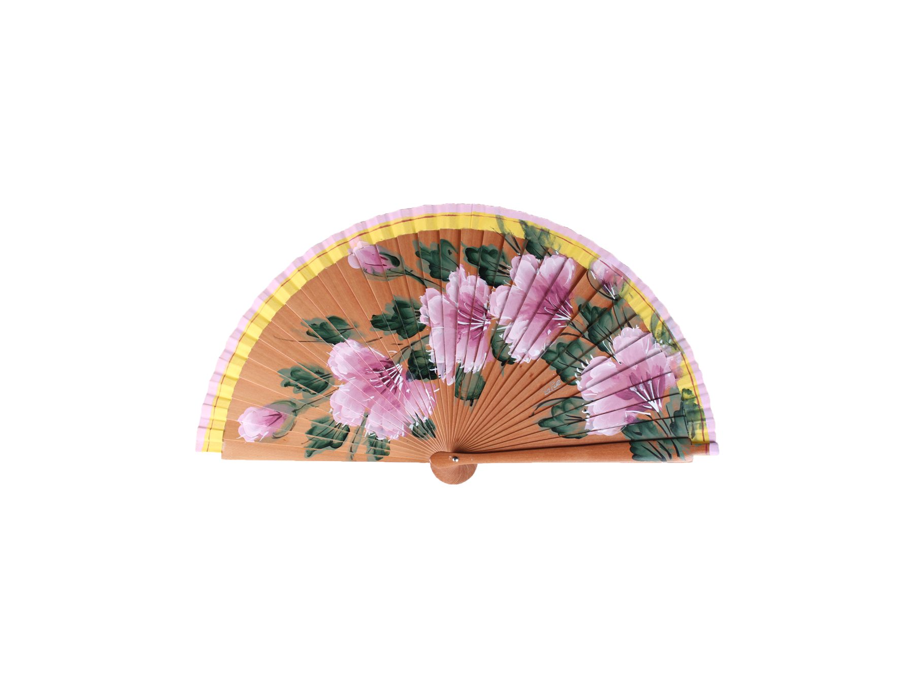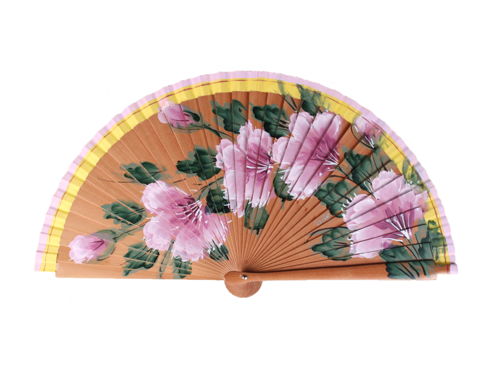 El varillaje conserva el color natural de la madera, por este se extienden unas preciosas flores de color rosa degradado acompañadas de hojas verdes.