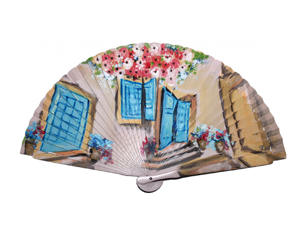Varillaje en color crema por el que se extiende la pintura de ventanales azules acompañaos de flores en color azul y rojo.