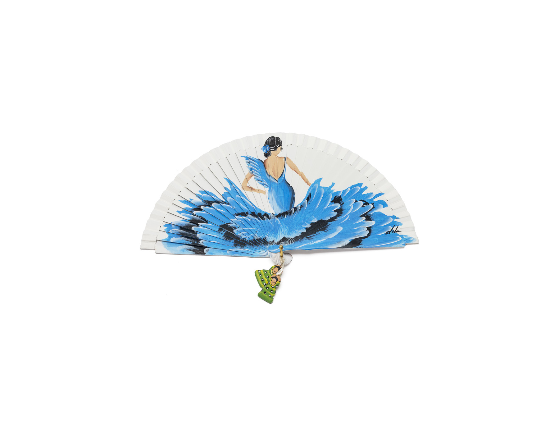 Varillaje en color blanco opacado por una elegante mujer con llamativo vestido de pluma en color azul con detalles blancos y negros