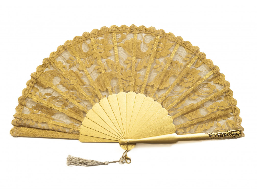 Precioso abanico de encaje que dibuja bonitas flores en el país, terminado en puntillo.