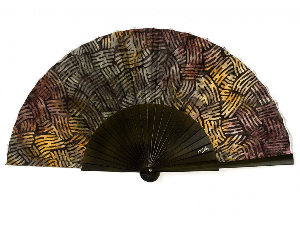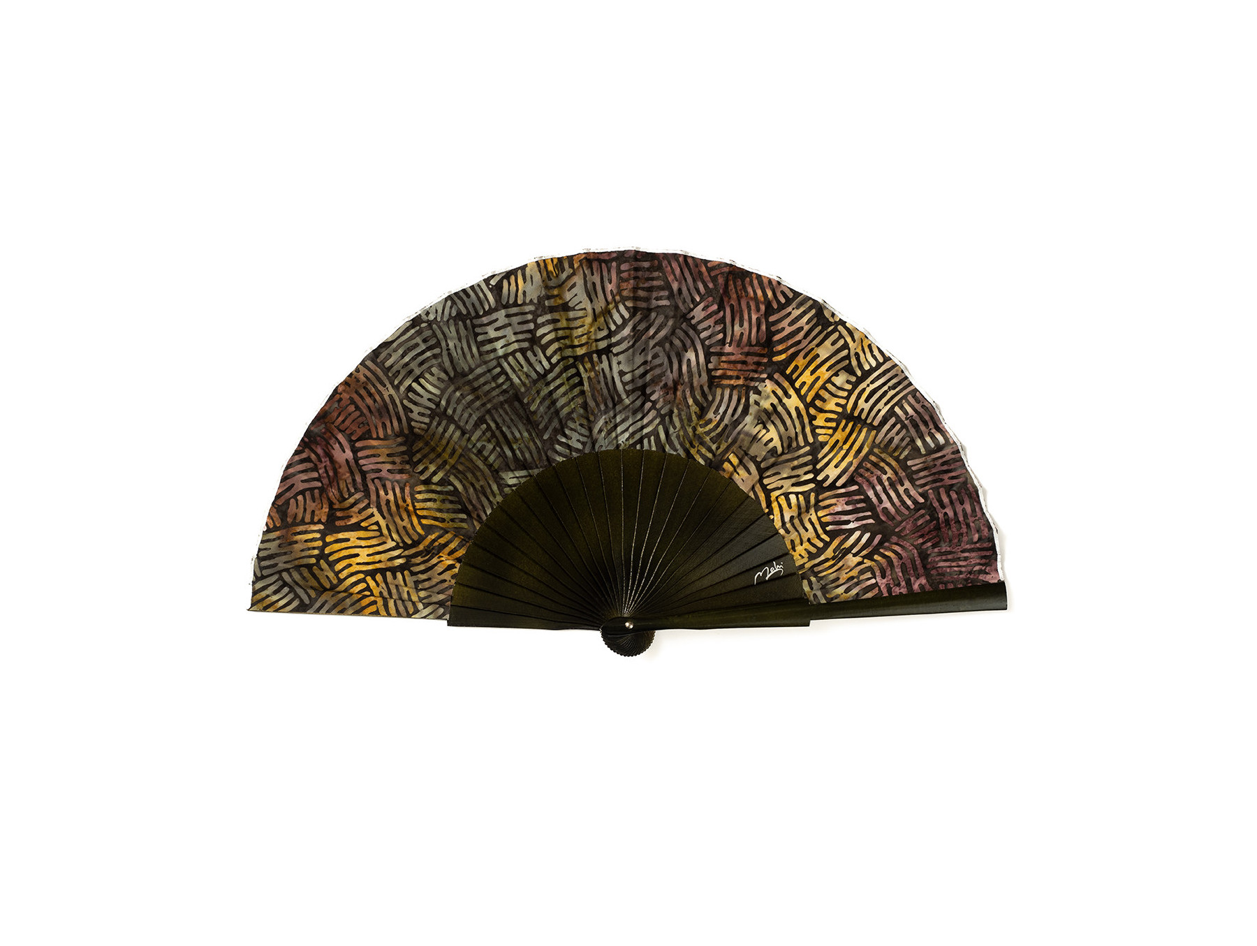Abanico artesanal, elaborado en madera de abedul con varillas en color verde. Con vistoso país de algodón estampado étnico, en tonos verdes y ocres.