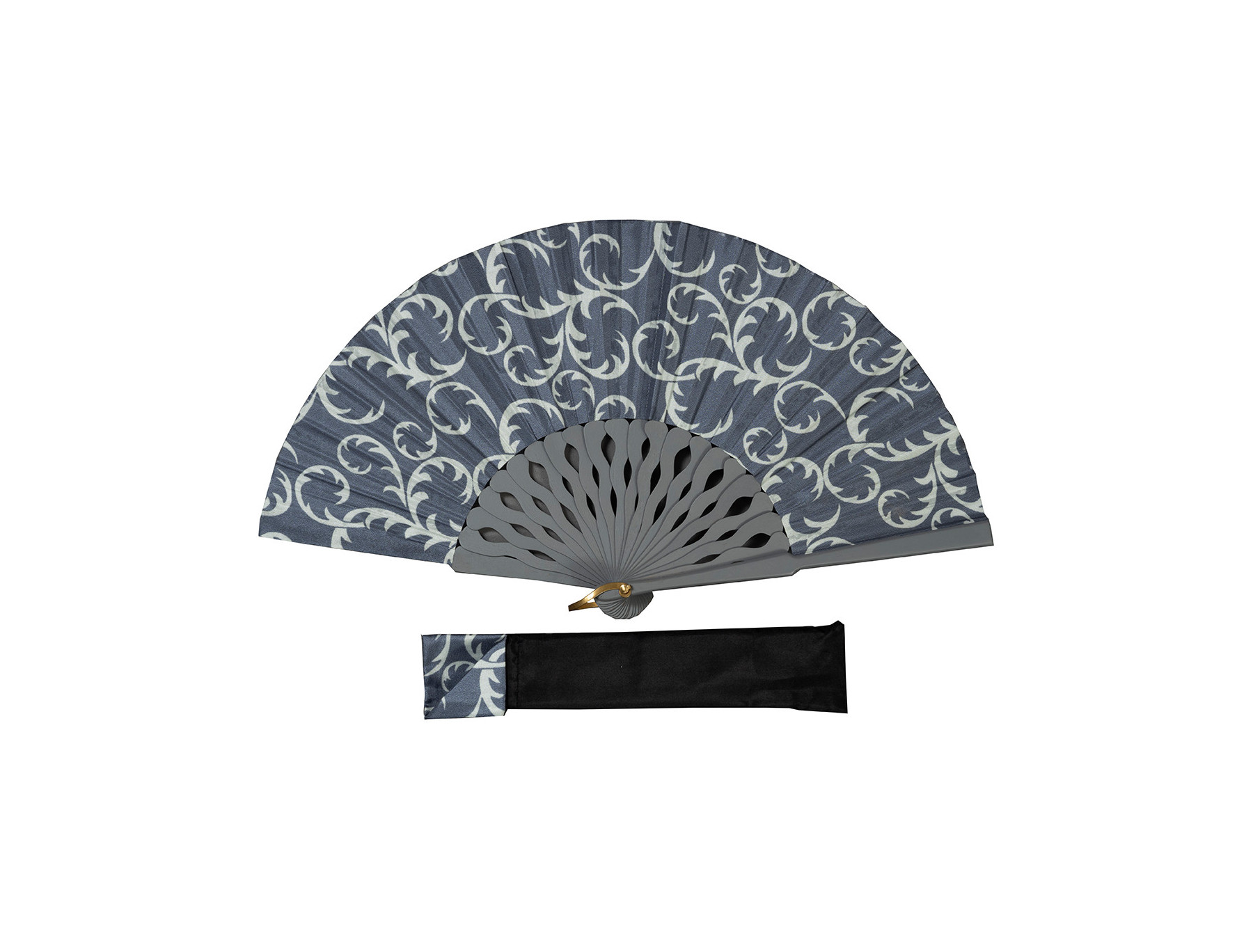 País en textil, fondo gris plomo decorado con volutas en gris claro