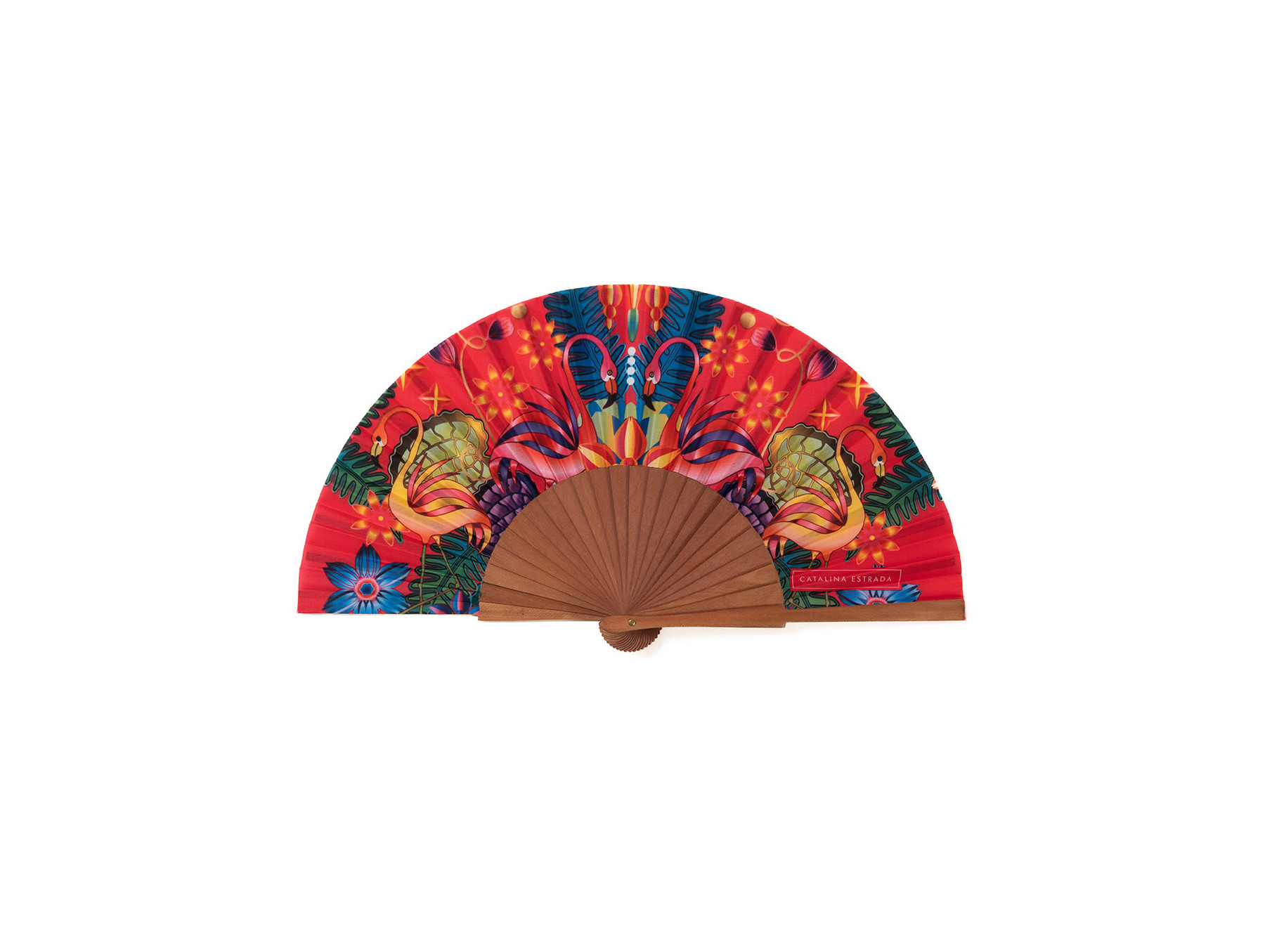 Colorido abanico de madera con país en tela diseñado por la ilustradora colombiana Catalina Estrada.