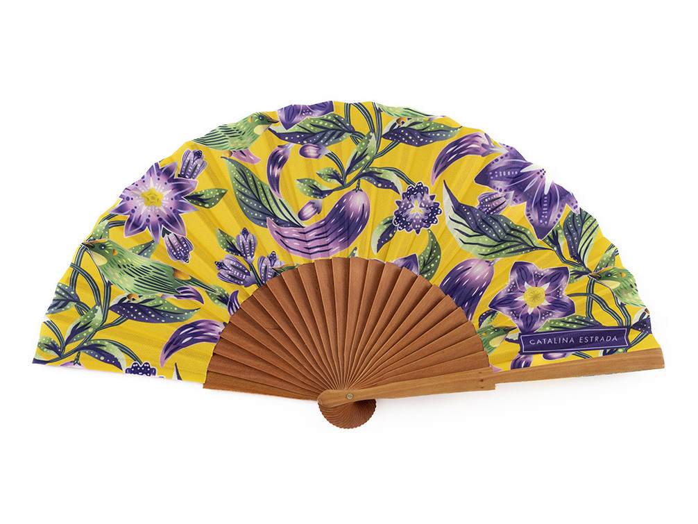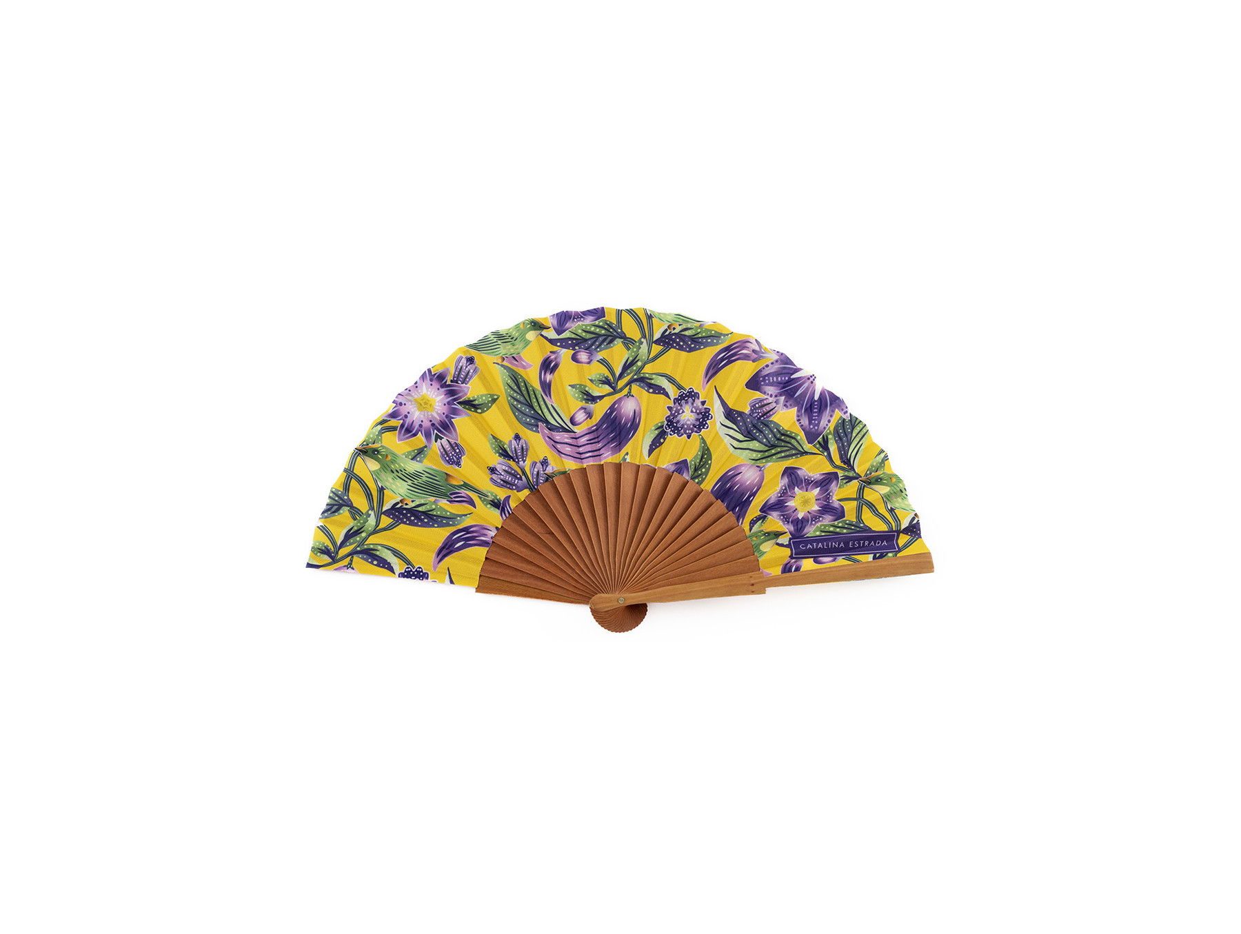 País de algodón con estampado floral de iris en color moradas acompañadas de hojas verdes sobre fondo amarillo