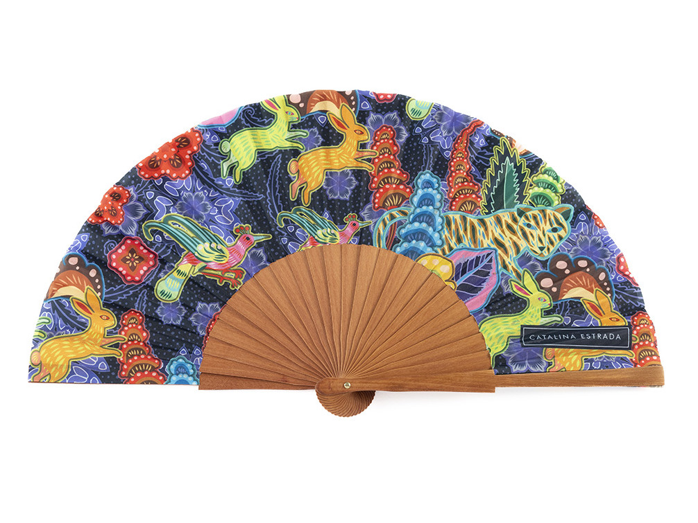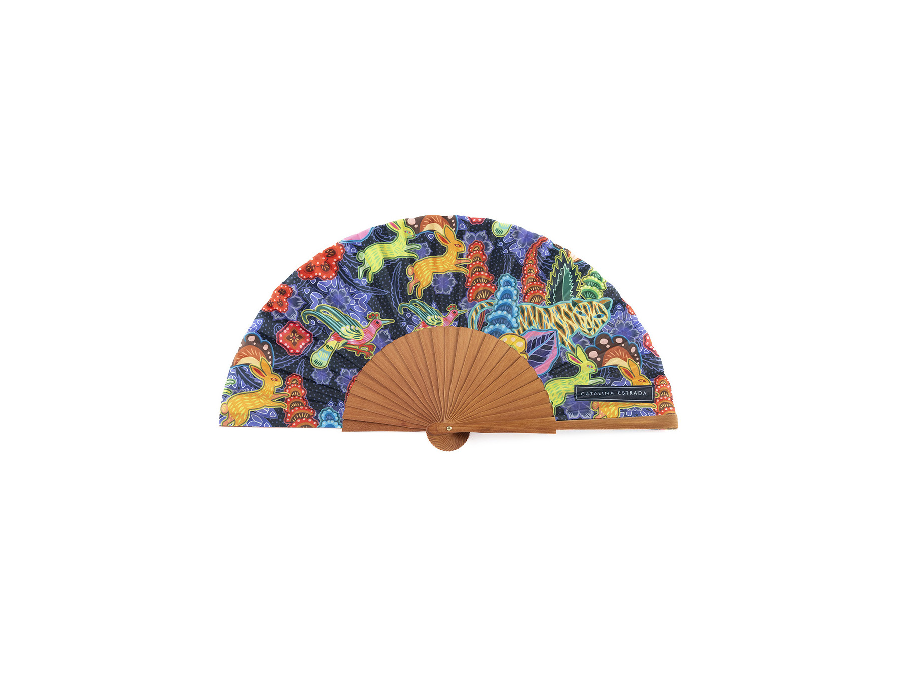 País de algodón con colorido estampado en color negro con coloridos detalles de distintos animales y plantas en colores rojo, verde, naranja, azul y amarillo