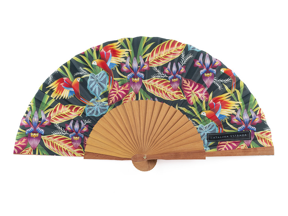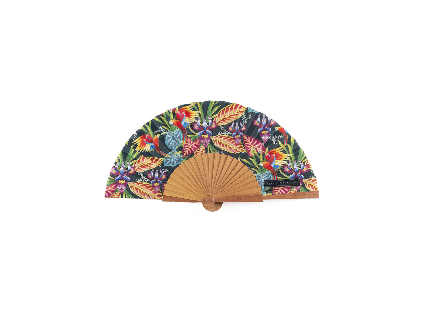 País de algodón con estampado juglar de diferentes colores donde se pueden apreciar bonitos guacamayos sobre un fondo verde oliva
