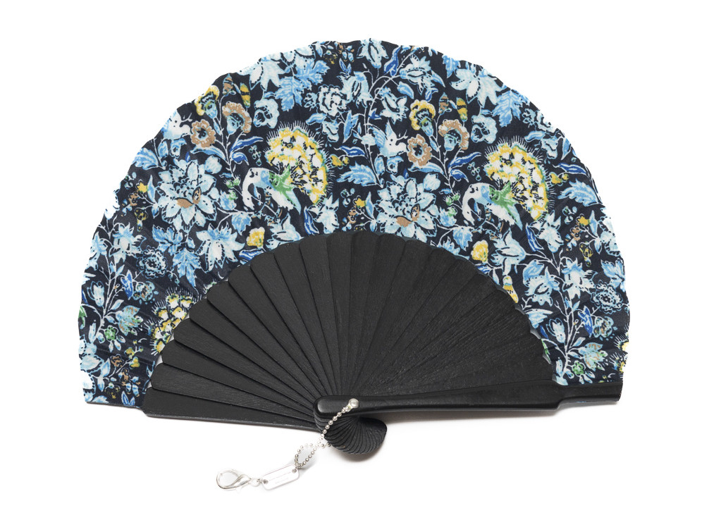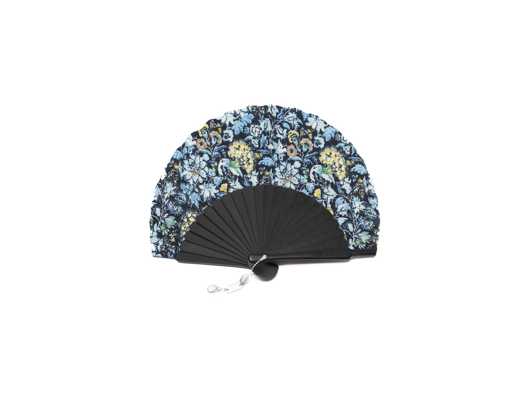 Abanico de seda con con diseño floral en distintos tonos azules, sobre país negro, que termina en una forma ovalada