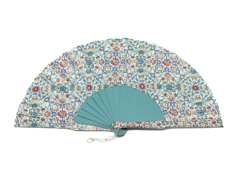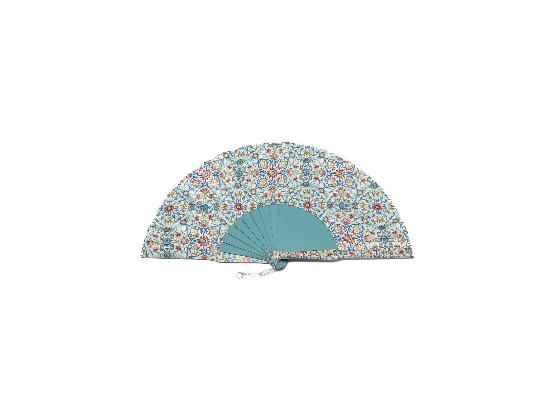 Abanico de seda con estampado floral en colores azul, verde y rojo sobre un país blanco