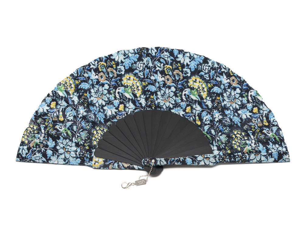 Abanico de seda con diseño floral en distintos tonos azules sobre un país negro