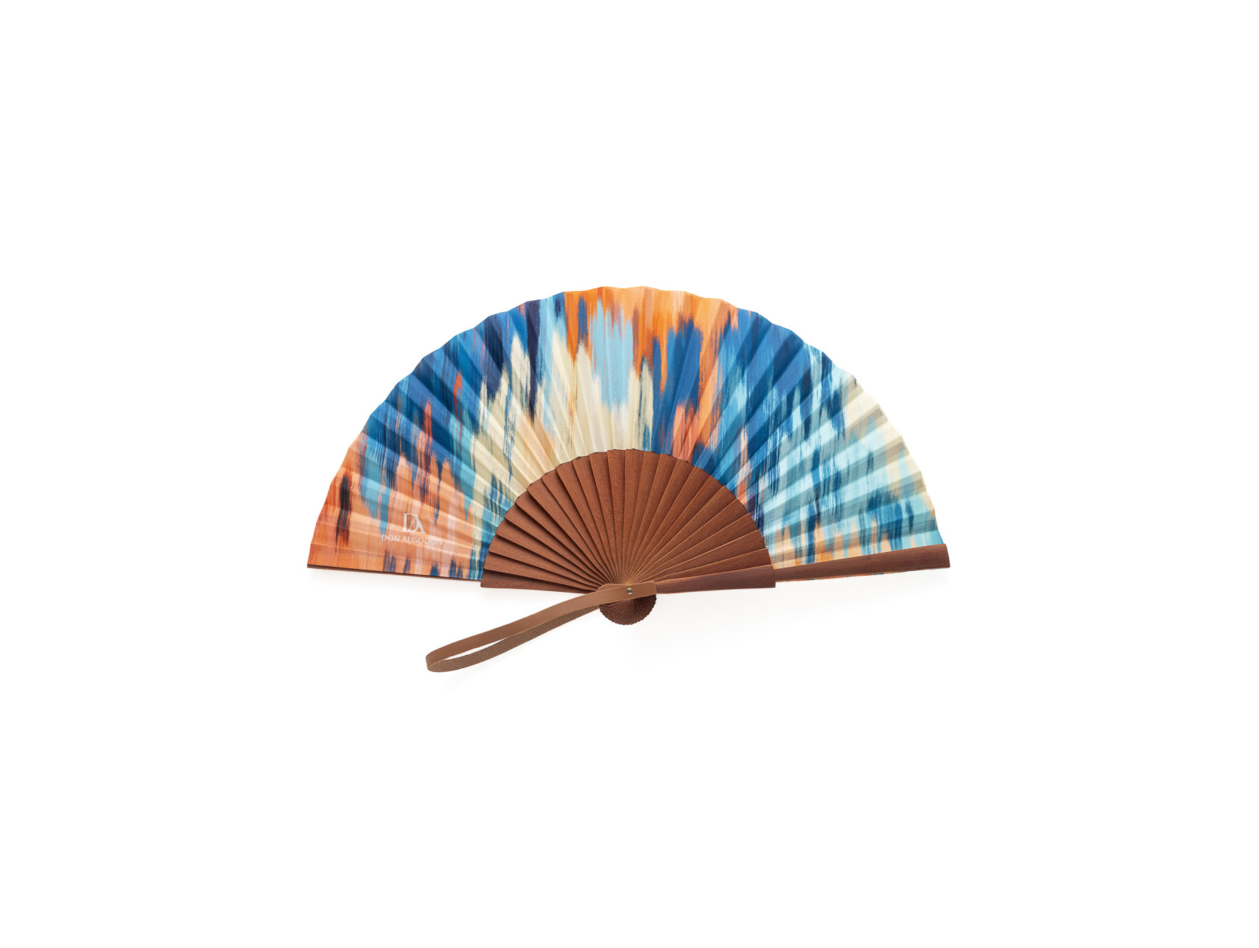 Llamativo abanico con estampado en su país de algodón en tonos azules y naranjas