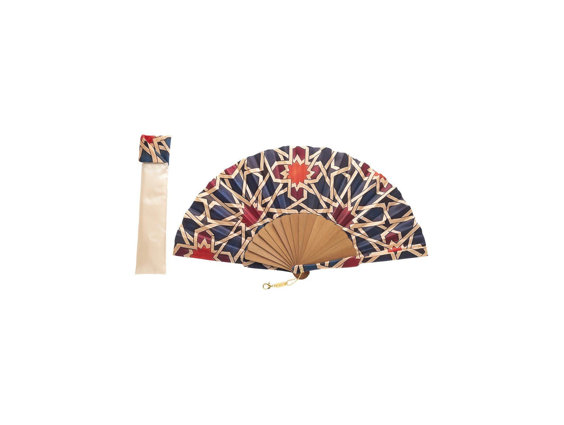 Varillaje en madera al natural y país en seda; trabajado estampado que recuerda a una baldosa con dibujo de estrellas