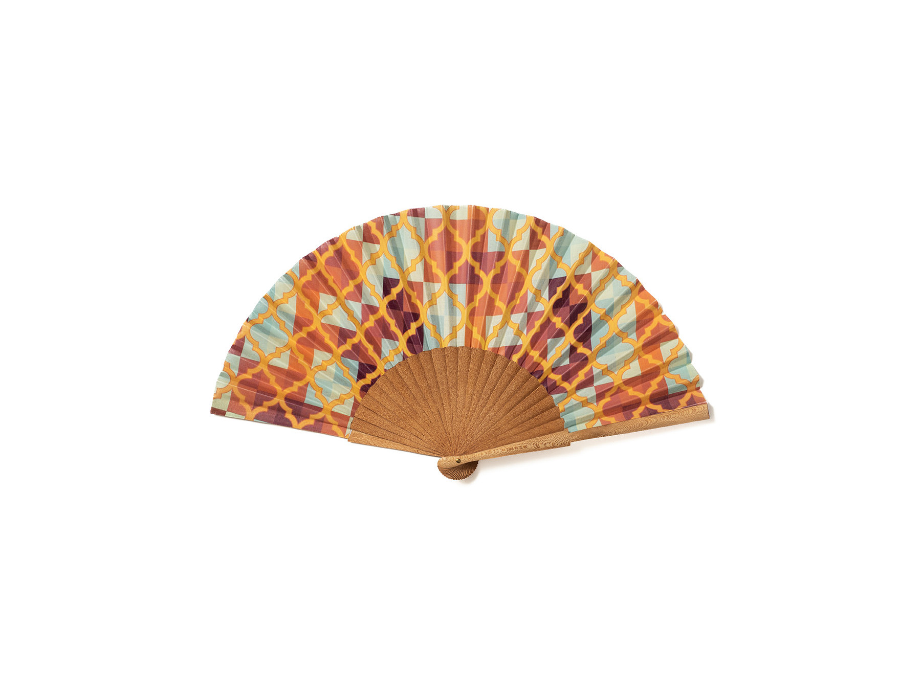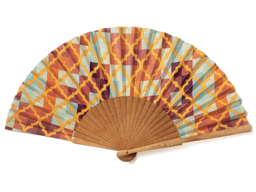 Alegre abanico artesanal, elaborado en madera de plátano. Con algodón estampado y detalle de greca/mosaico en tonos amarillos y naranjas.