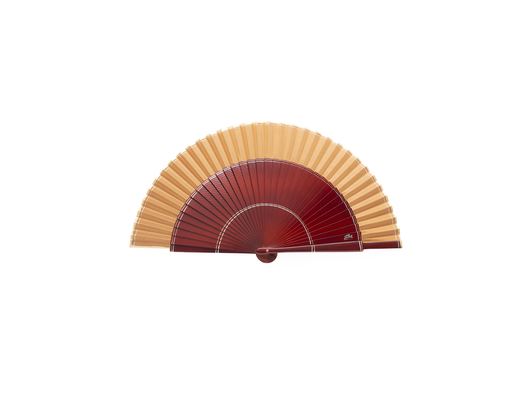 Abanico en color rosa realizado en madera de sapelly, satinado por ambas caras. Varillas lisas