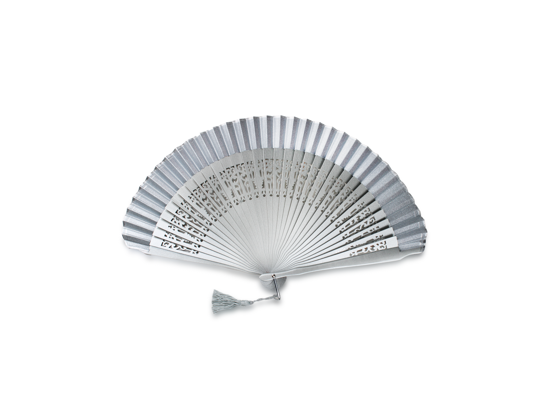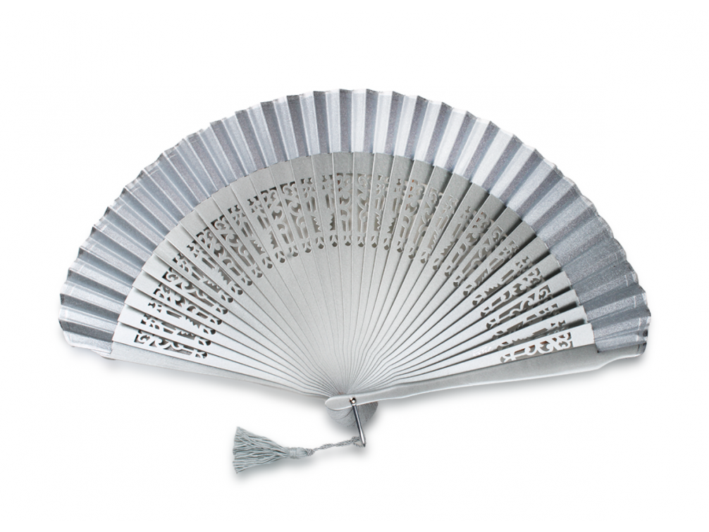 Abanico en color platino realizado en madera de sapelly, satinado por ambas caras.