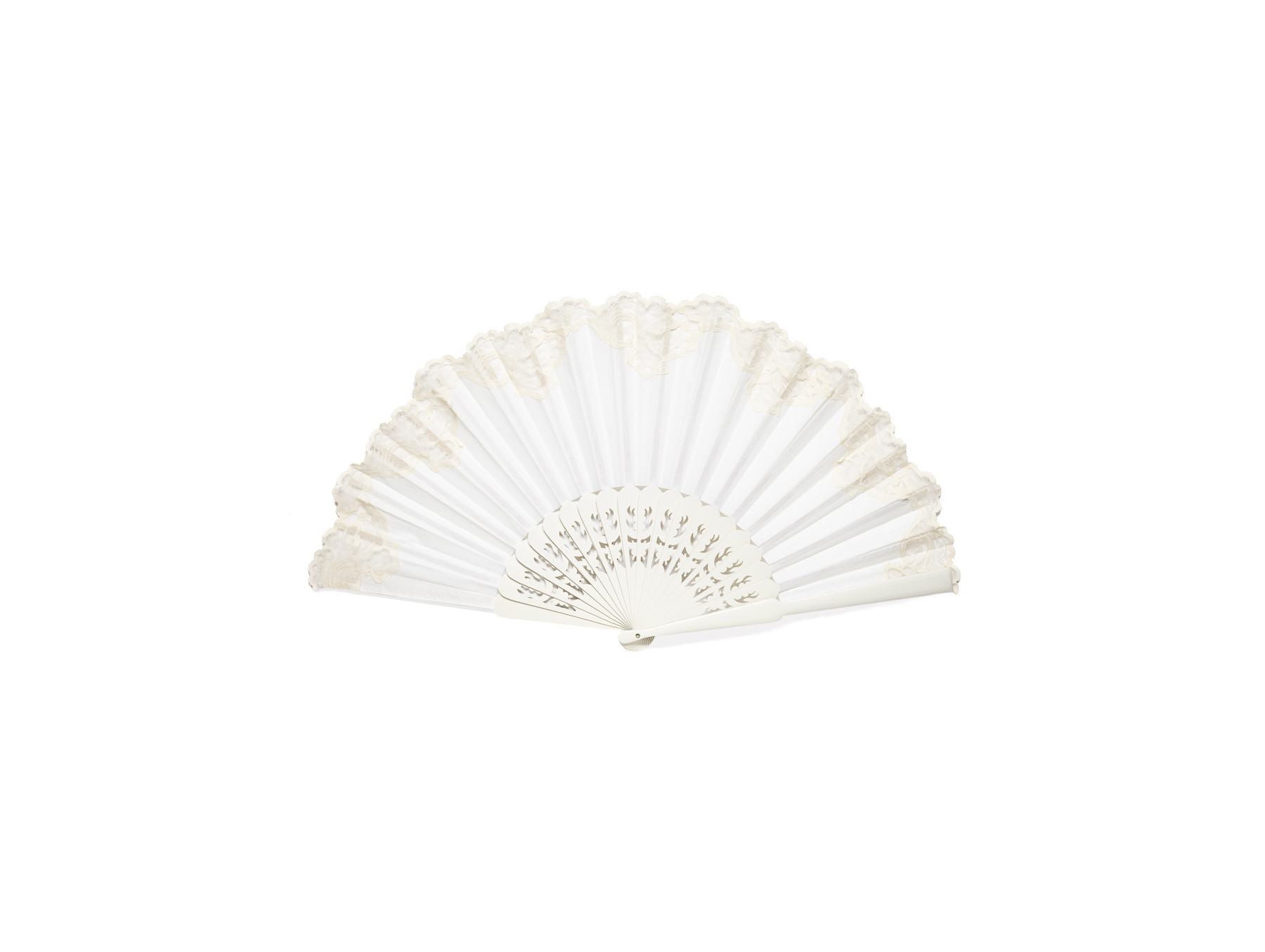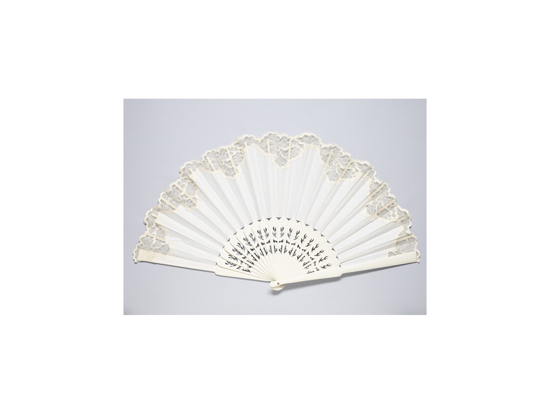 Precioso abanico pericón realizado en madera calada y algodón rematado con puntilla.
