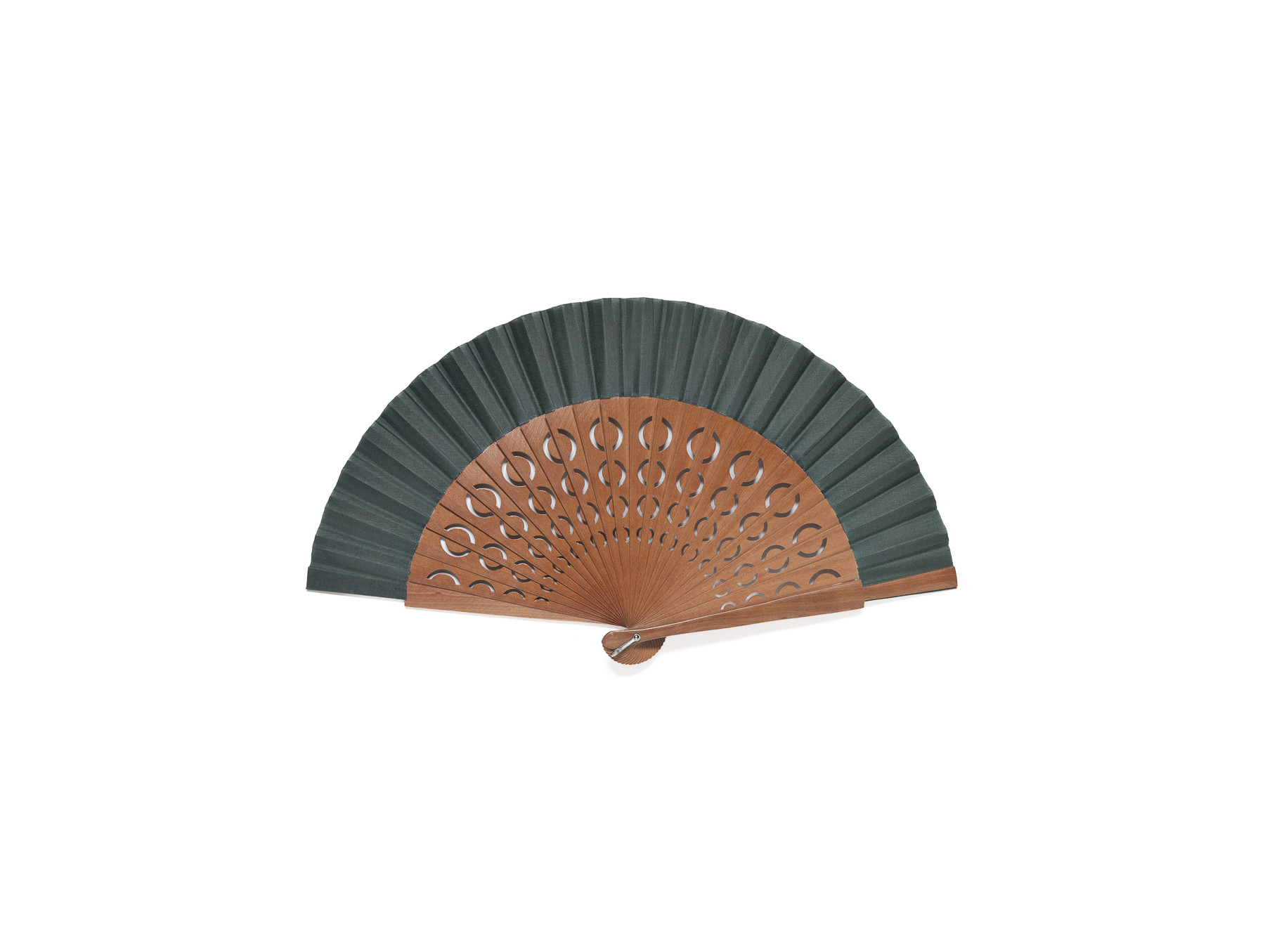 Abanico de madera de nogal con original diseño de calado en su varillaje en formas circulares