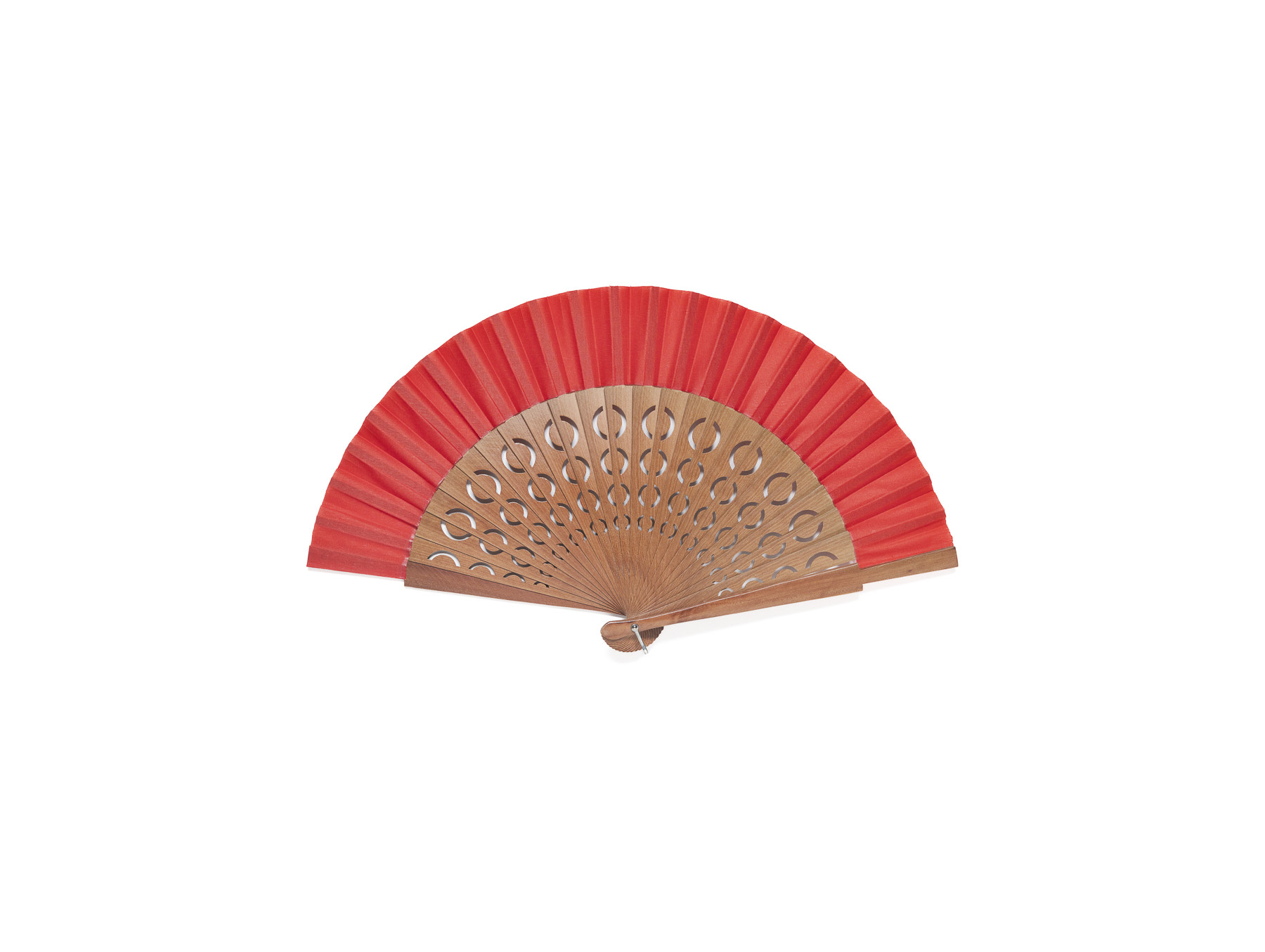 Abanico de madera de nogal con original diseño de calado en su varillaje en formas circulares