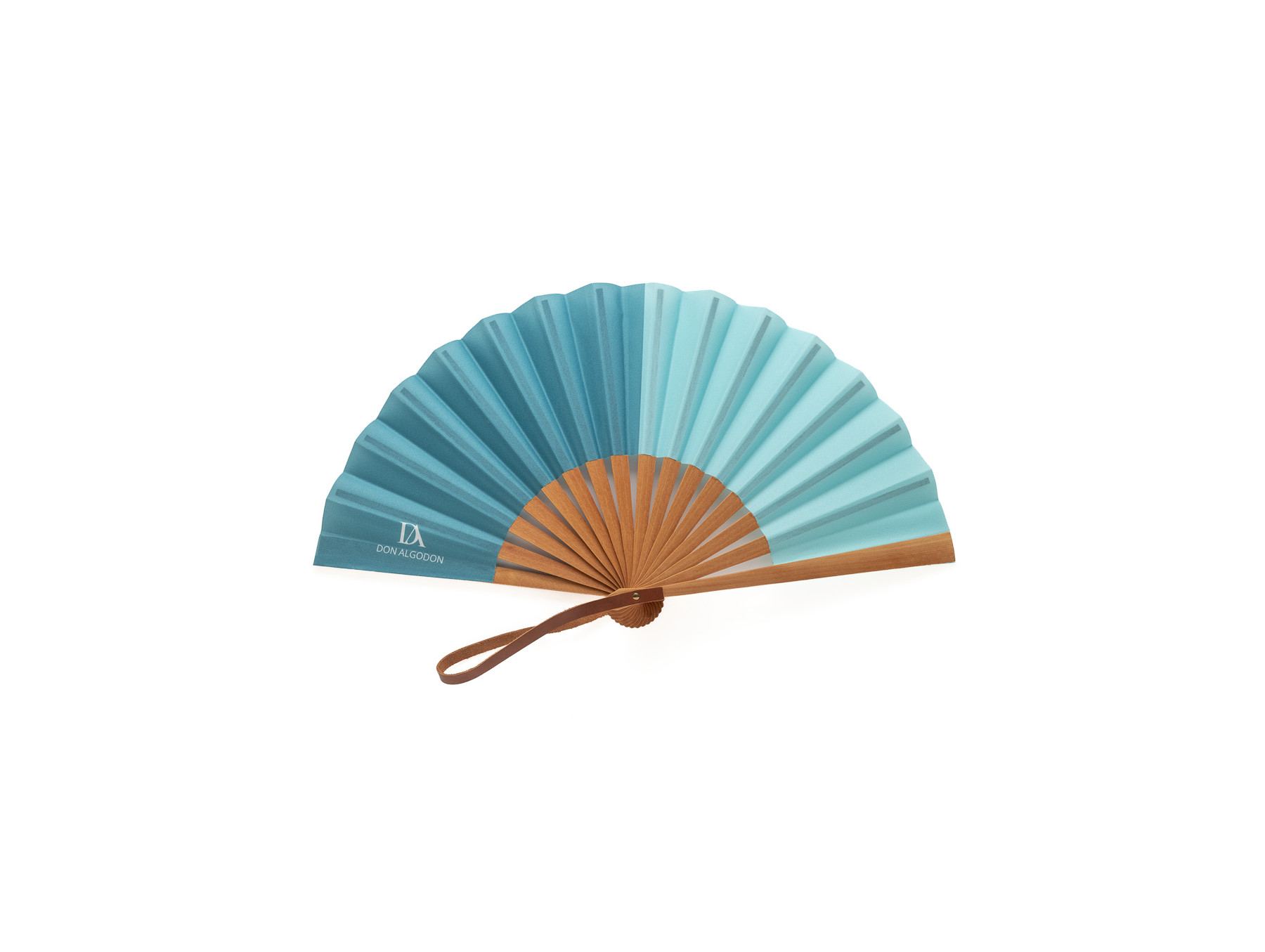 País de algodón dividido en dos tonos de azul que destacan sobre la madera natural del abanico