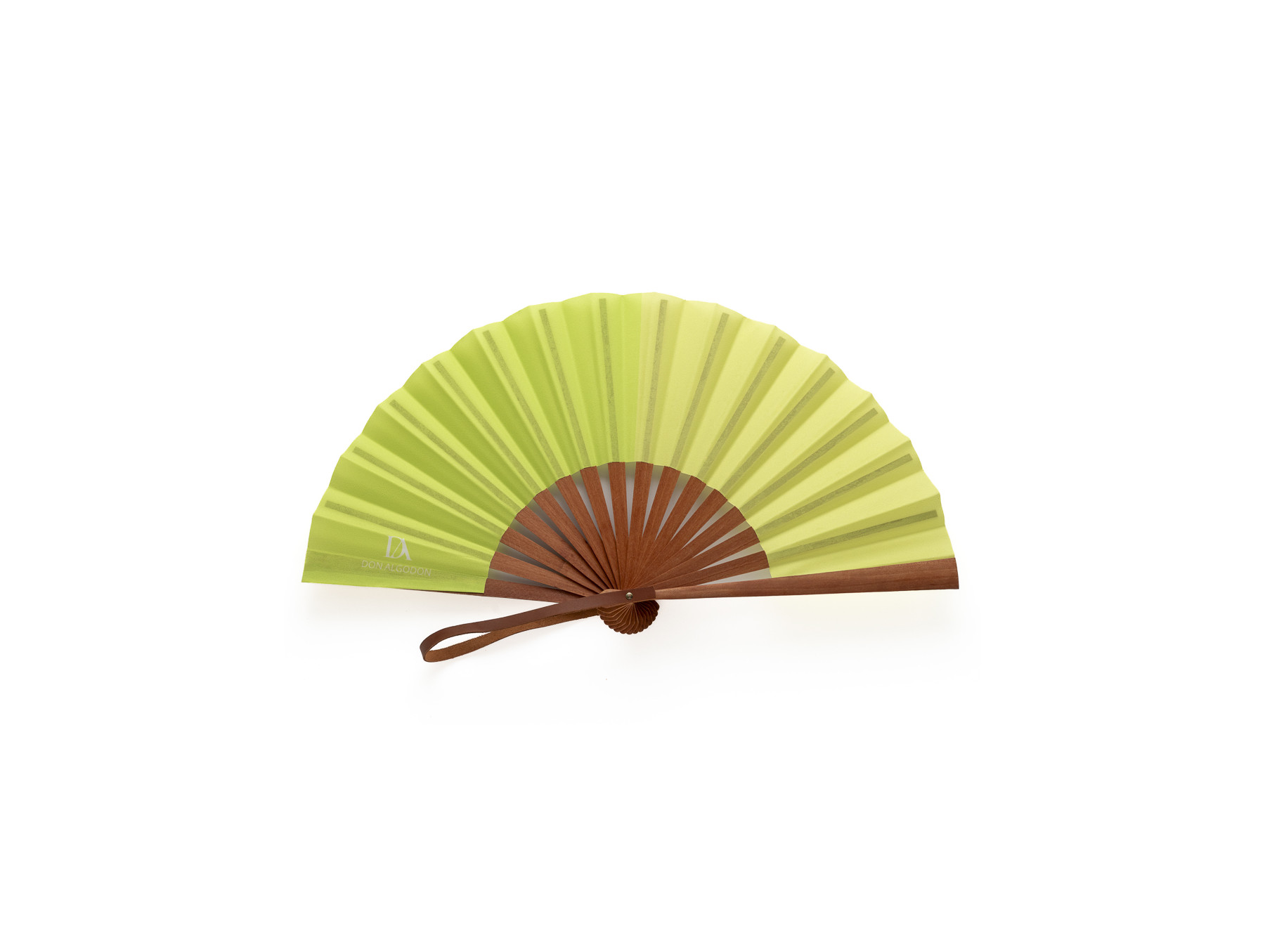 País de algodón dividido en dos tonos de verde lima que destacan sobre la madera natural del abanico