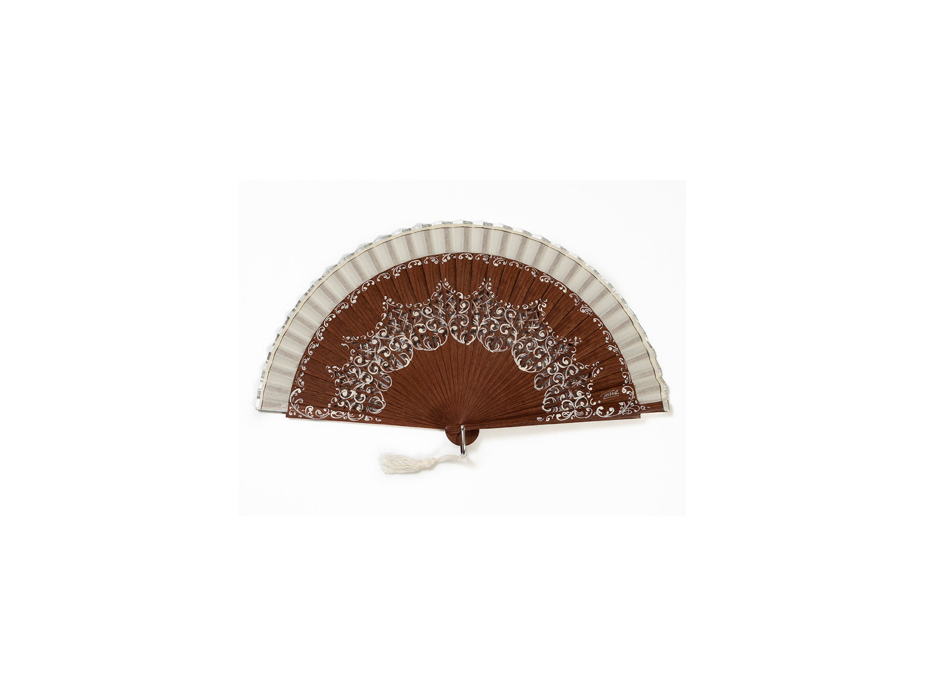 Pulido por ambas caras. Pintado a mano. Pequeñas volutas en color marfil bordean el tallado de su parte central; mismas decoraciones en varillas principales y parte superior del varillaje