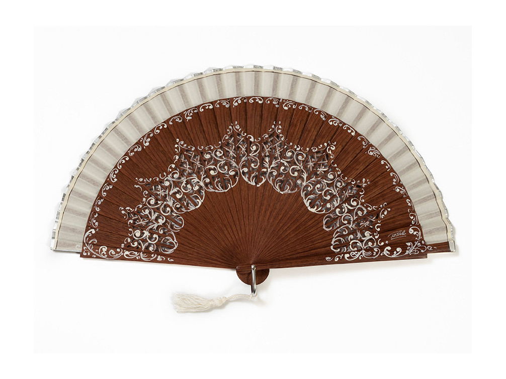 Pulido por ambas caras. Pintado a mano. Pequeñas volutas en color marfil bordean el tallado de su parte central; mismas decoraciones en varillas principales y parte superior del varillaje