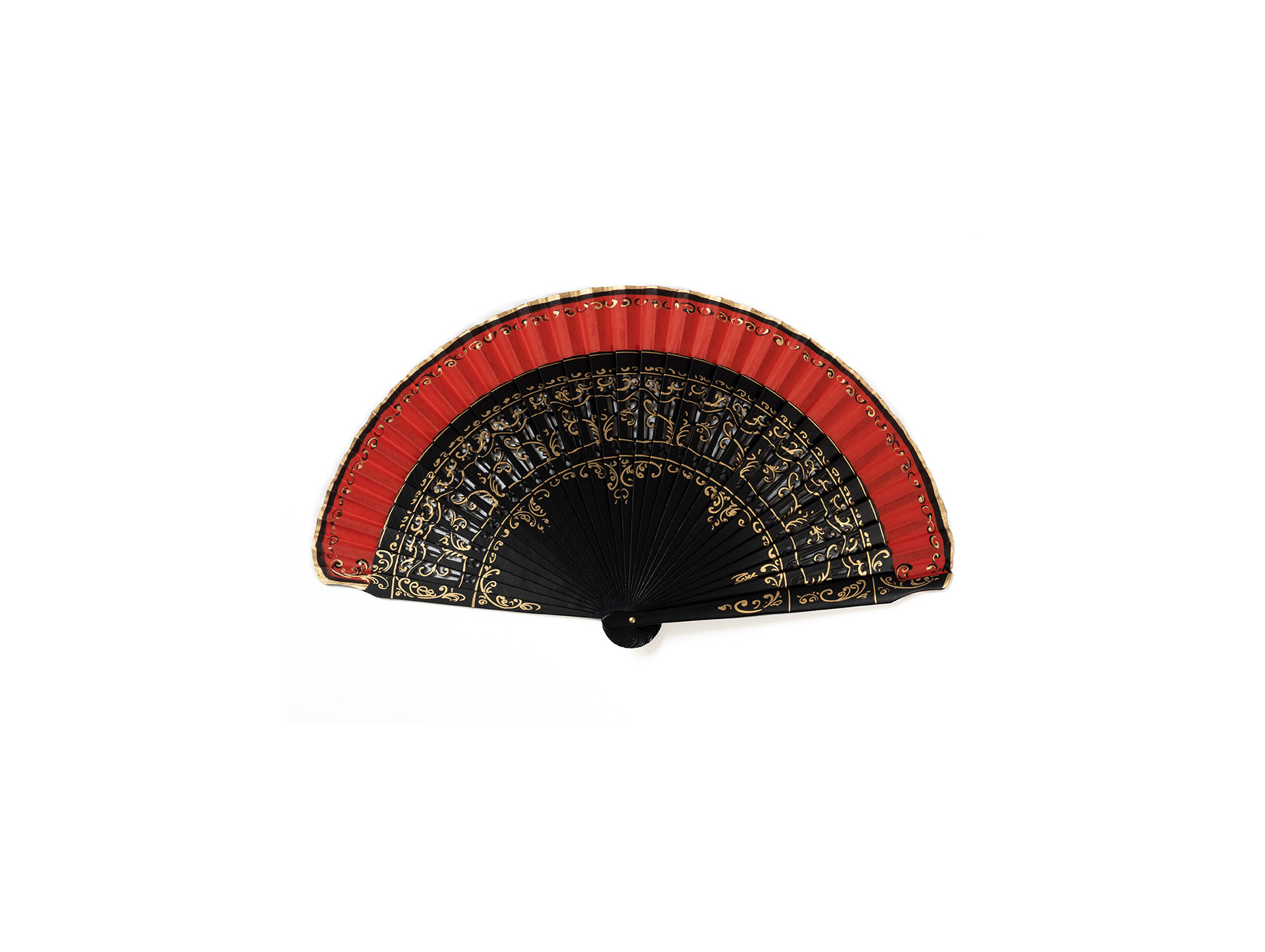 Pequeñas ondas y volutas pintadas a mano adornan tanto varillas como país de algodón: éste en color rojo