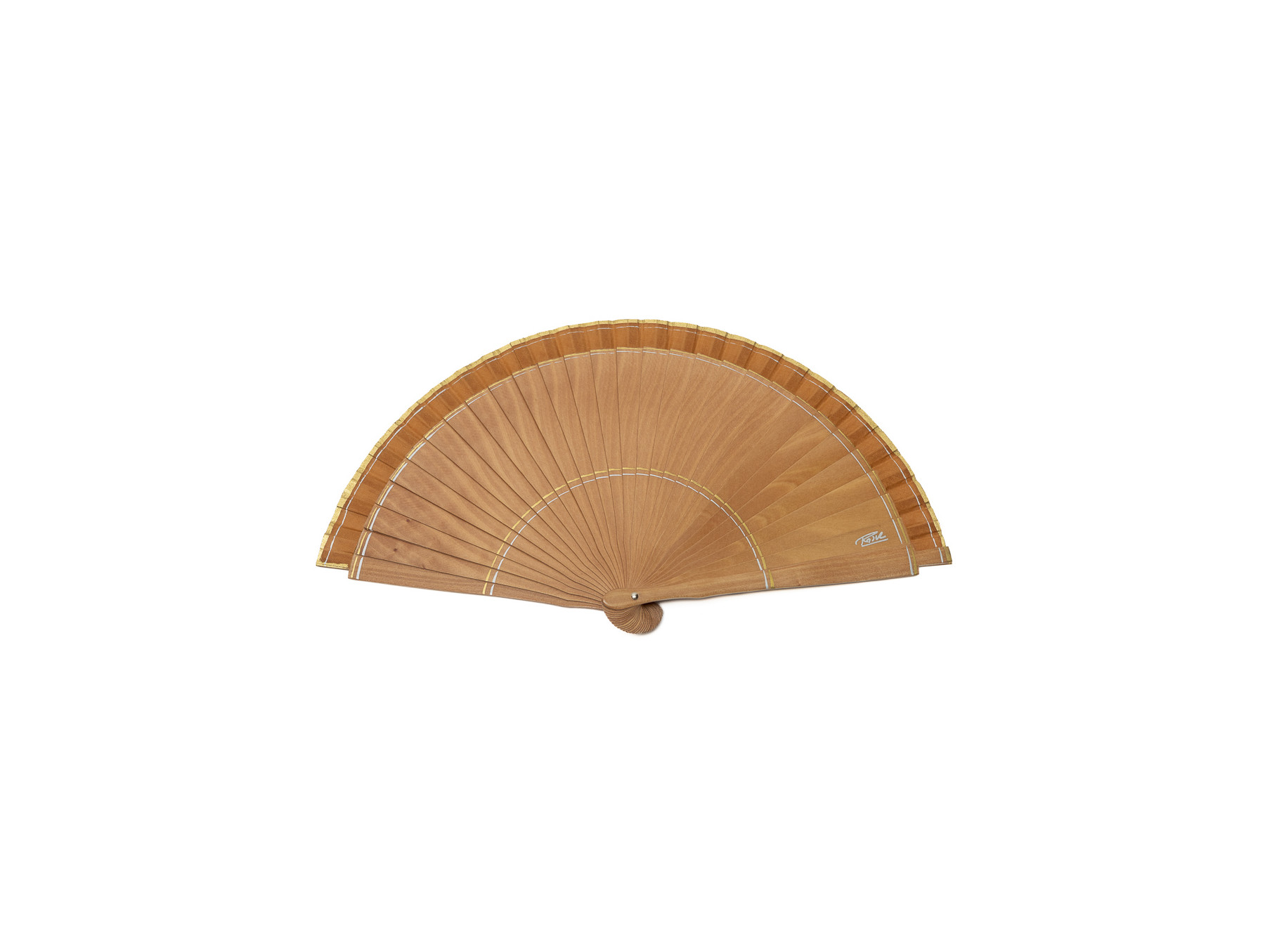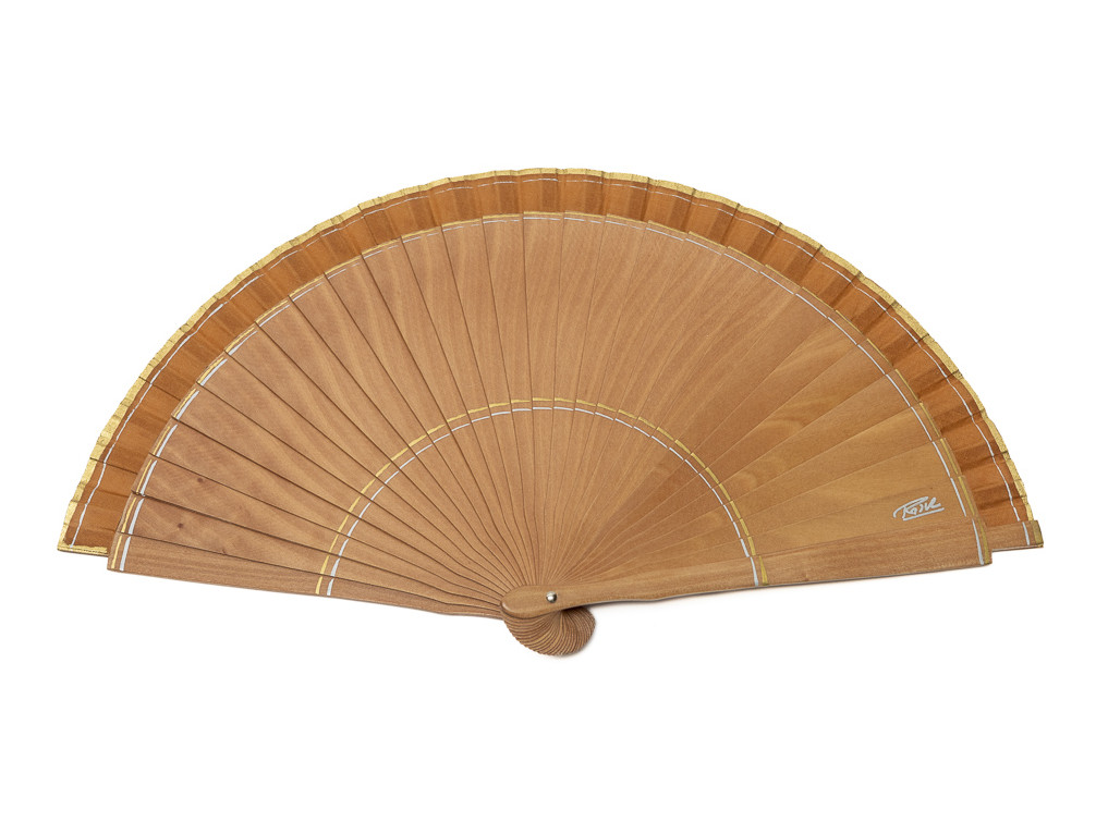 Abanico en madera de abedul de varillaje liso que mantiene su color natural, con elegantes detalles que rodean al abanico en colores dorado y plateado que se extienden hasta el país, también en color madera
