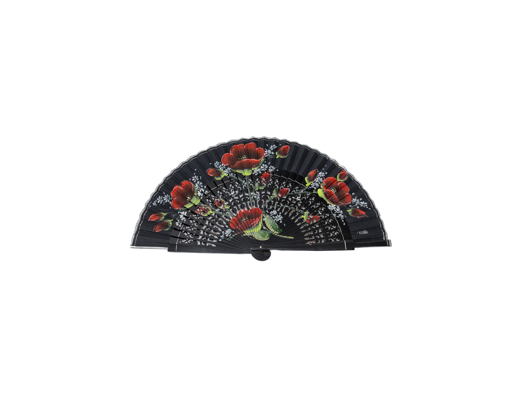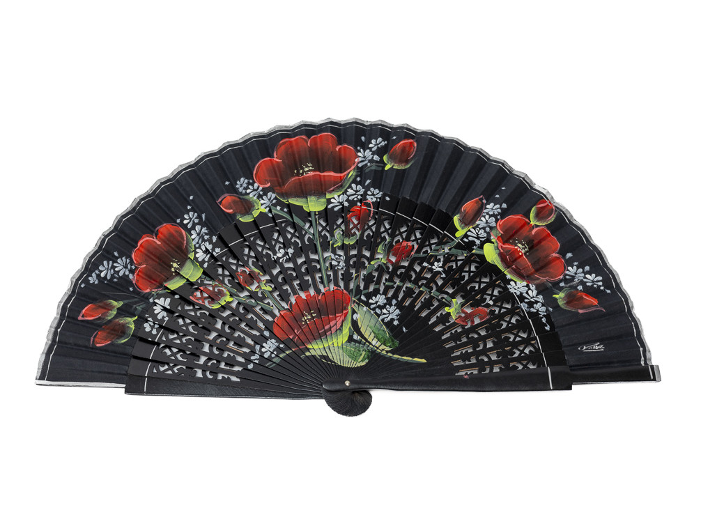 País de algodón también en color negro. Cuatro amapolas en rojo vivo acompañadas de pequeñas flores blancas, ramas en verde y capullos también en rojo se extienden por el abanico