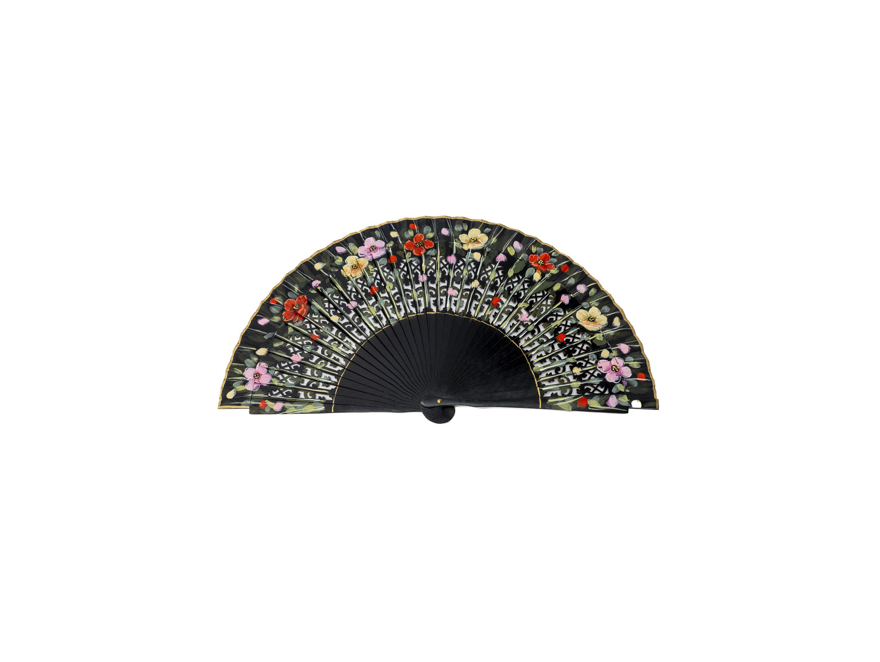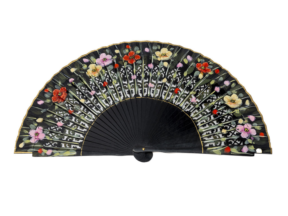 Madera en color negro, satinado por ambas caras. Varillas caladas, desde la que asoman alegres flores y capullos en colores rosa, rojo y vainilla