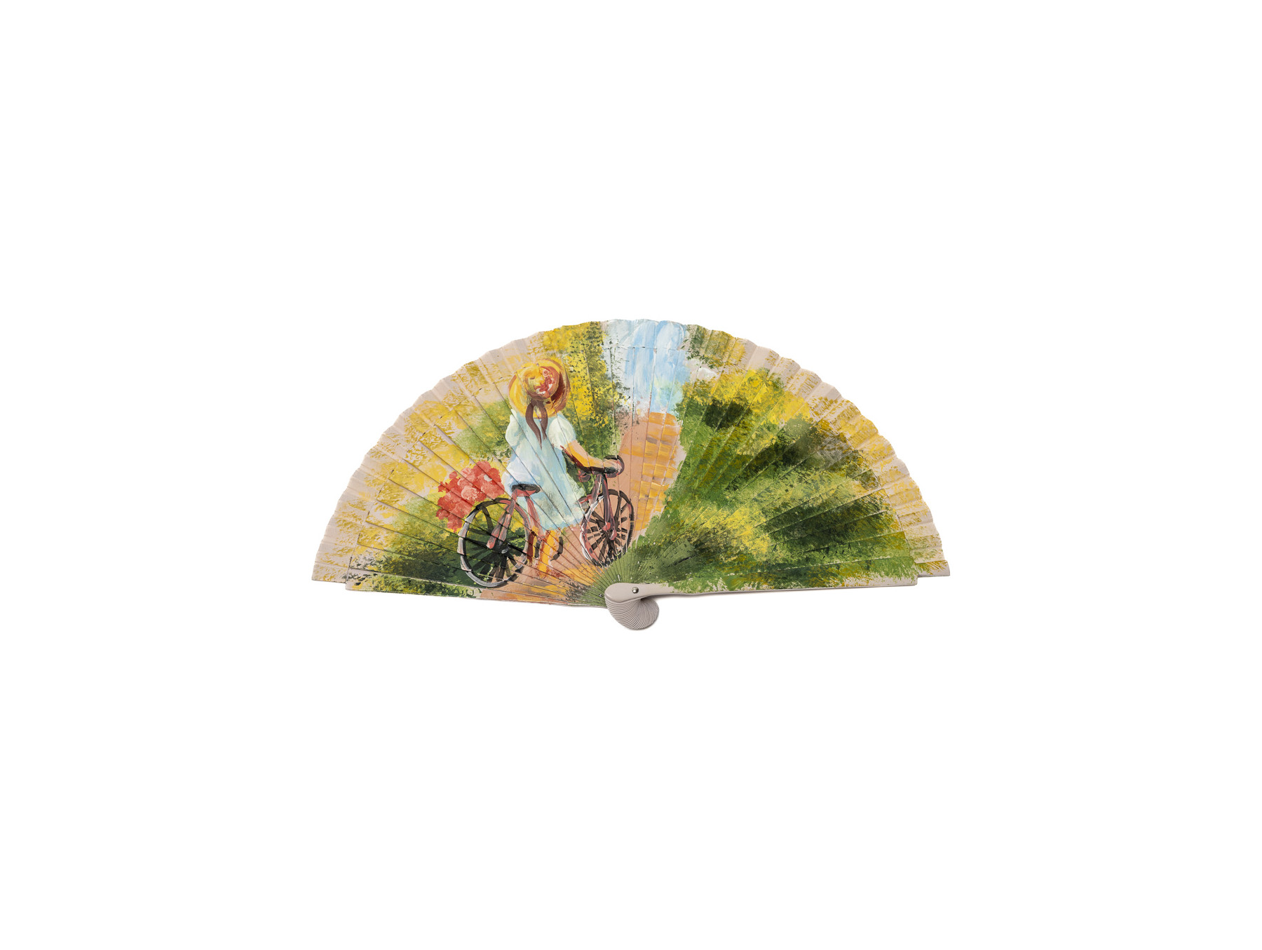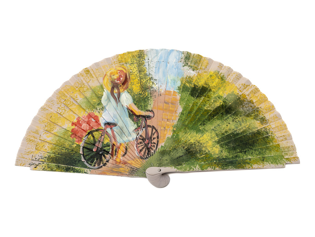Simpático abanico pintado a mano. Una niña con pamela da un paseo por una senda montada en su bici rosa, sobre la que lleva un ramo de flores