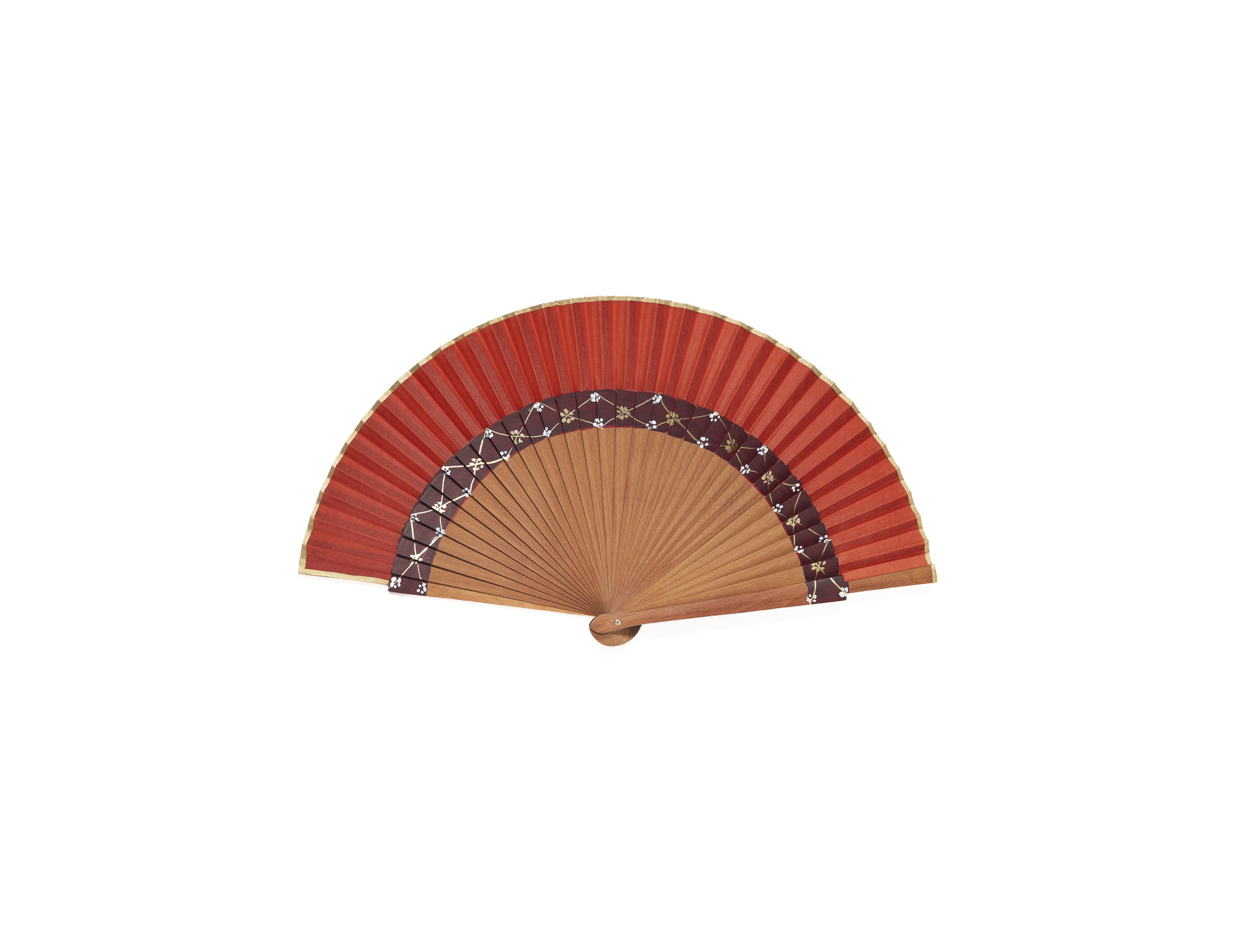 Sobre su varillaje, de color natural del abanico, se extiende una tira de color granate sobre la que se dibujan florecillas en color blanco y dorado, a juego con el filet del abanico, también en dorado