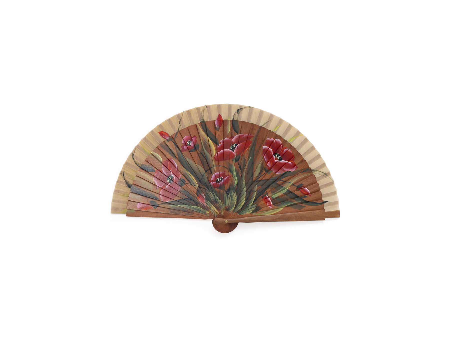 Abanico en madera de abedul de varillaje liso barnizado con diseño de amapolas que se extienden por todo el abanico, pintado a mano