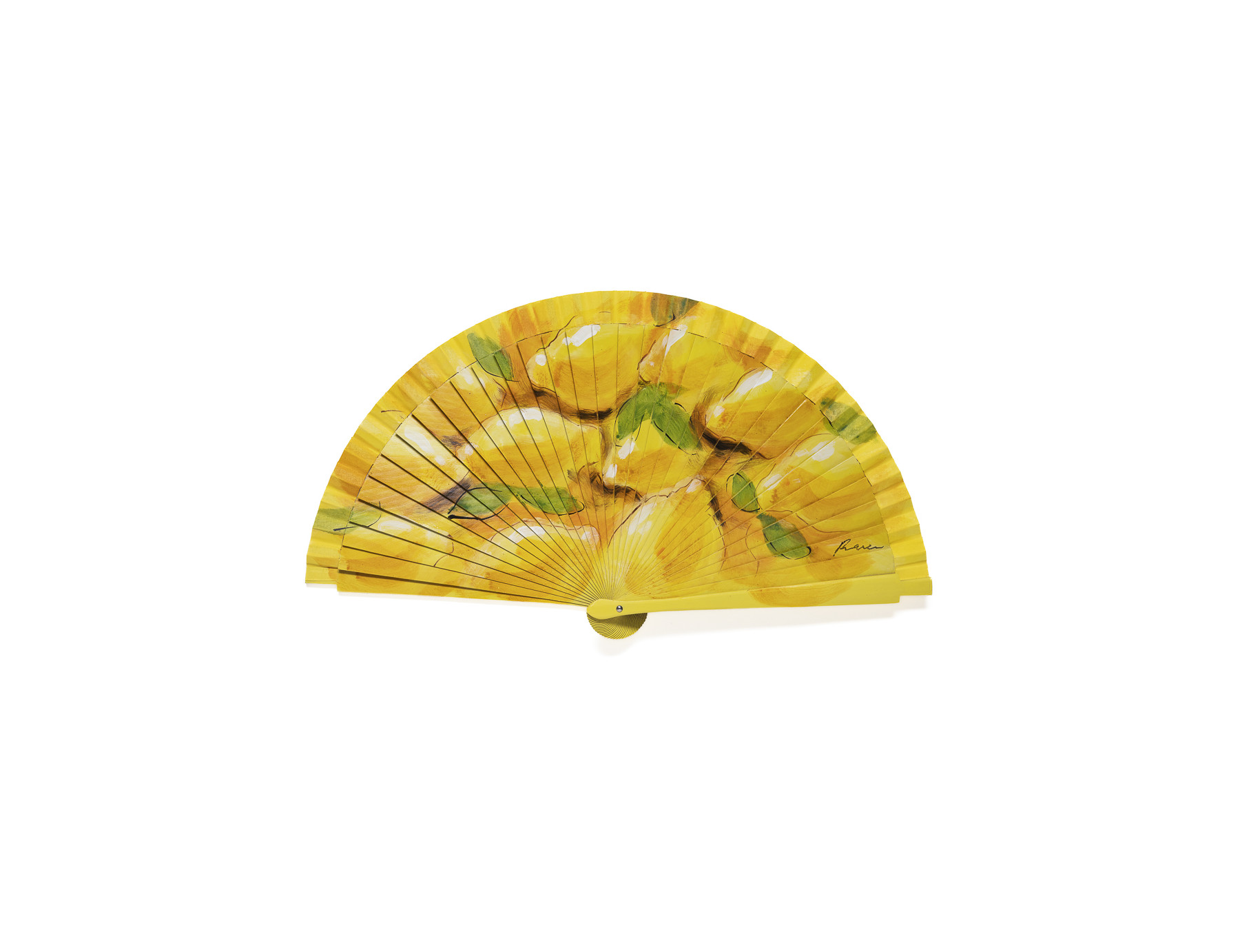 En su varillaje se dibuja un amable diseño de limones que se extiende por todo el abanico