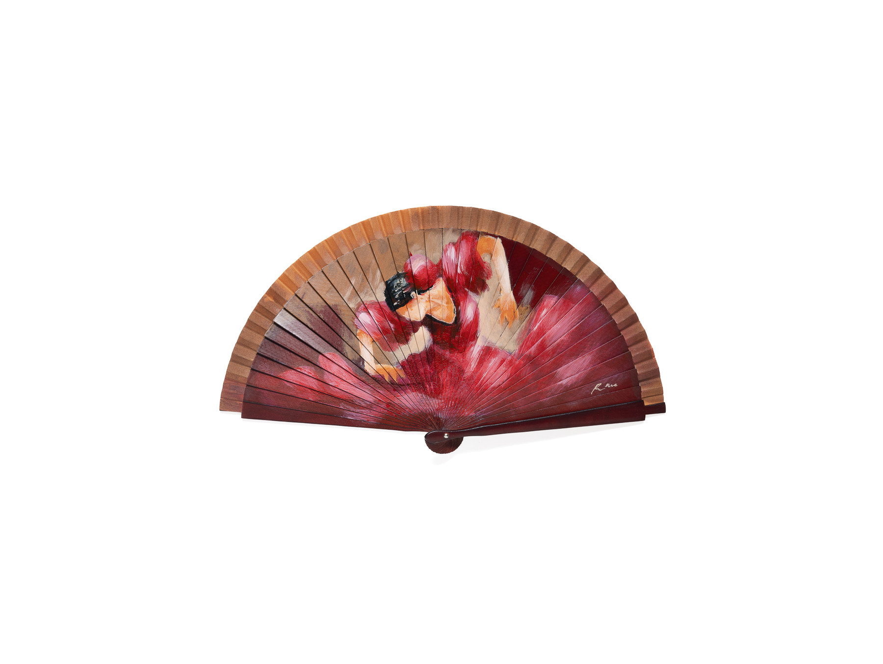 Una flamenca baila sobre su varillaje con un vestido en tonos rojos, sobre el fondo color arena del abanico